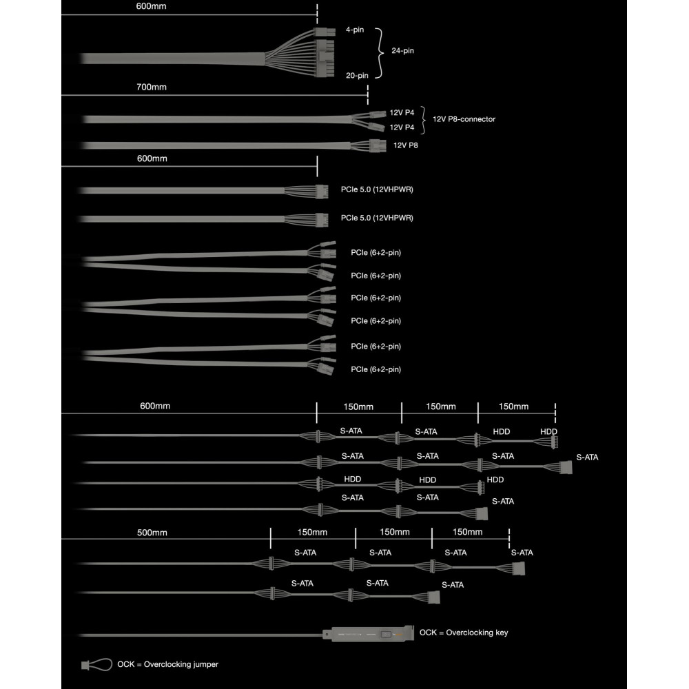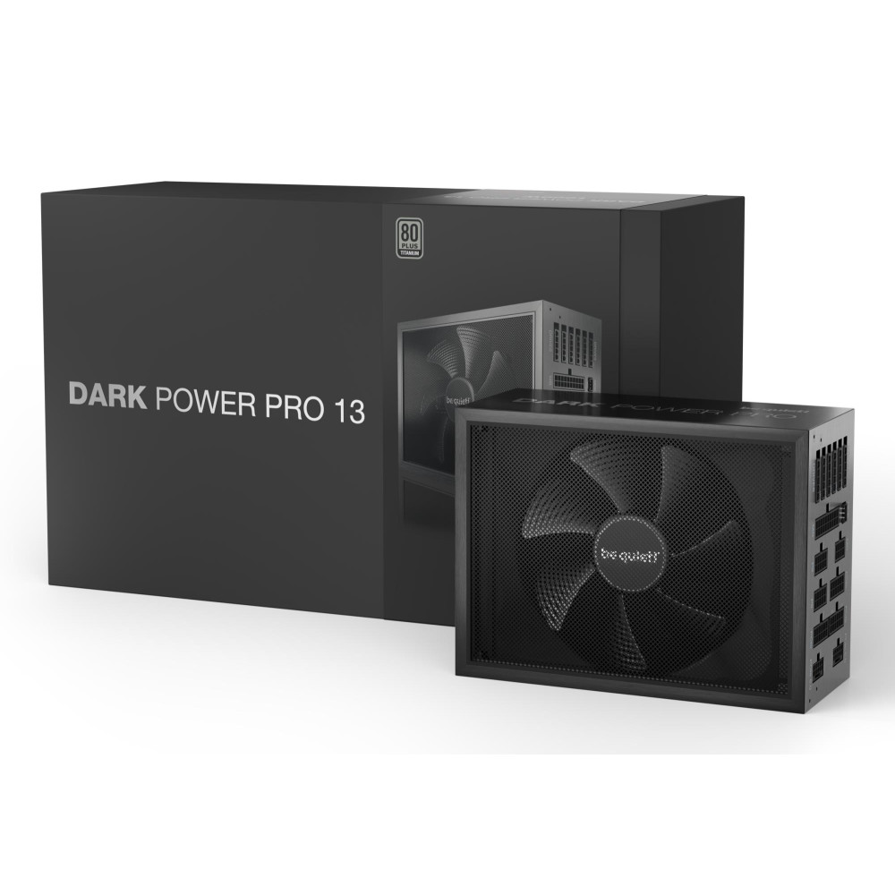 be quiet! Dark Power Pro 13 , 1300W. Total power: 1300 W, AC input voltage: 115 - 240 V, Peak power: 1400 W. Motherboard power connector: 20+4 pin ATX, Motherboard power cable length: 60 cm, SATA power cable length: 500,600,750,800,900,950,1050 mm. Purpose: PC, Power supply unit (PSU) form factor: ATX, 80 PLUS certification: 80 PLUS Titanium. Product colour: Black, Cooling type: Active, Fan diameter: 13.5 cm. Cables included: CPU, PCIe, Peripheral (Molex), SATA