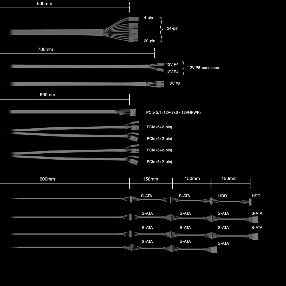 Summary be quiet! Dark Power 14 850 W - 80 Plus Titanium. Total power: 850 W, AC input voltage: 100 - 240 V, Peak power: 950 W. Motherboard power connector: 20+4 pin ATX, Motherboard power cable length: 60 cm, SATA power cable length: 600,750,900,1050 mm. Purpose: PC, Power supply unit (PSU) form factor: ATX, 80 PLUS certification: 80 PLUS Titanium. Product colour: Black, Cooling type: Active, Fan diameter: 13.5 cm. Compliance certificates: CB, Federal Communications Commission (FCC), RoHS, TÜV mark, UKCA, WEEE, cTUVus