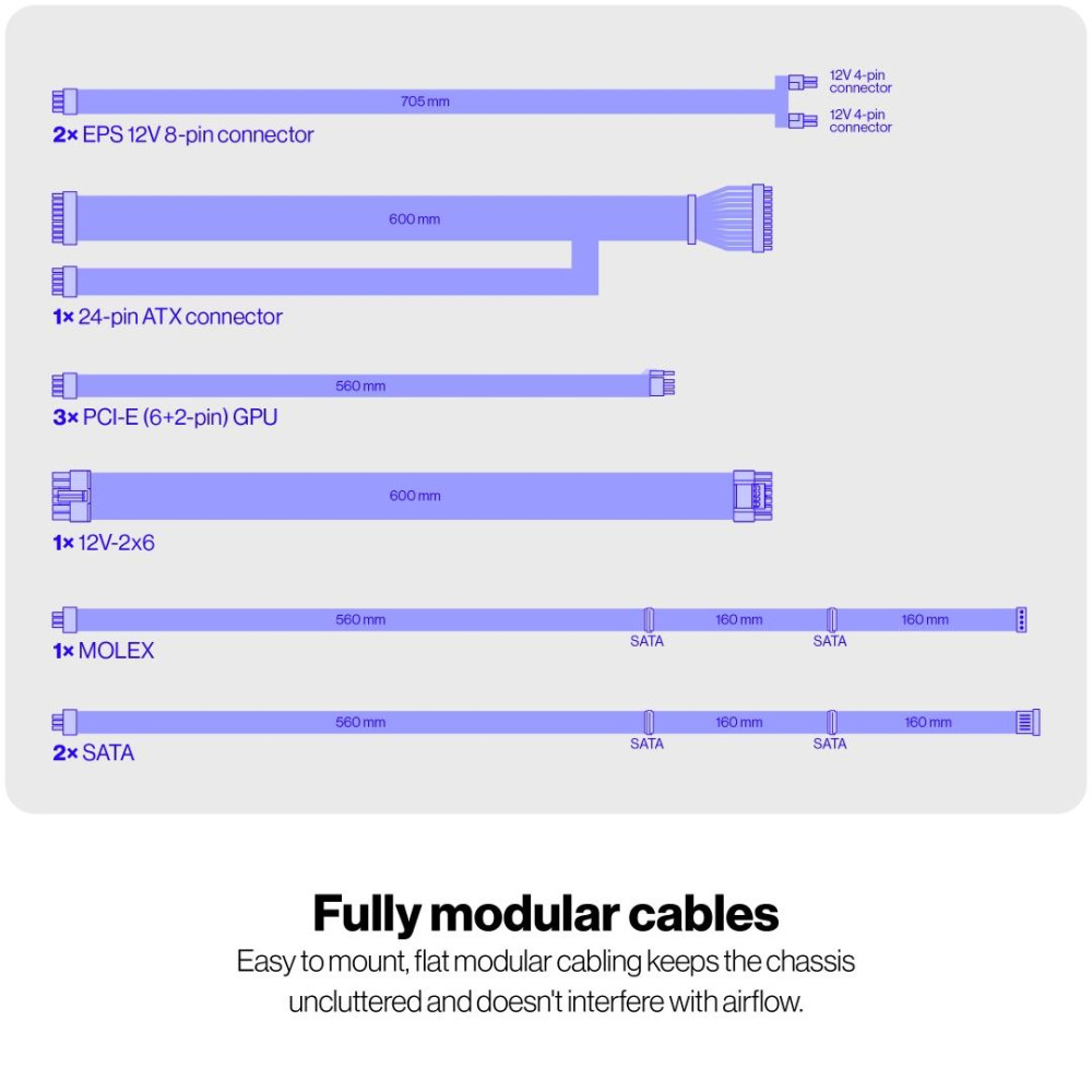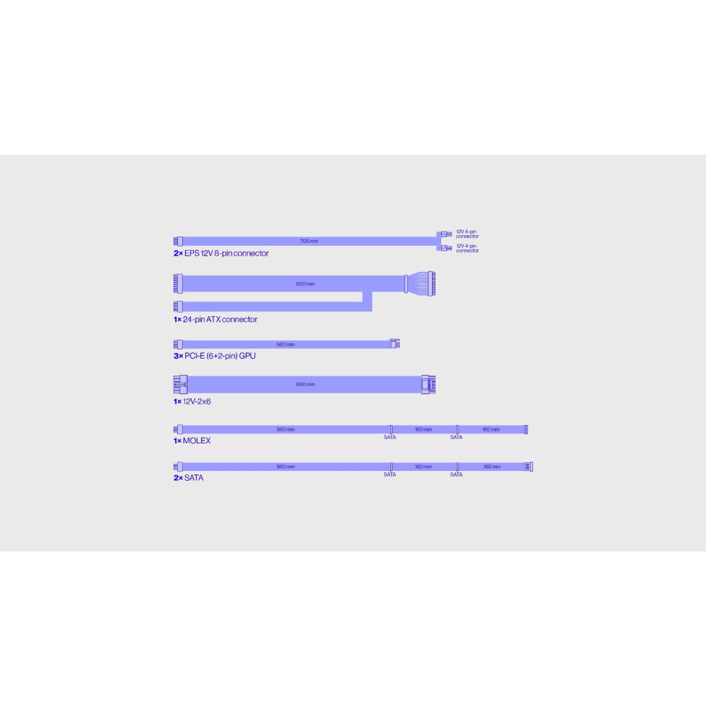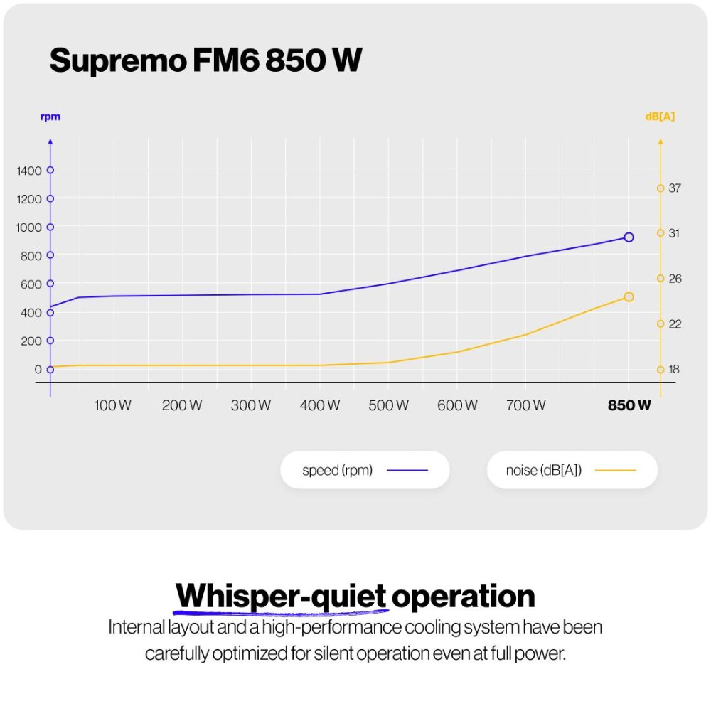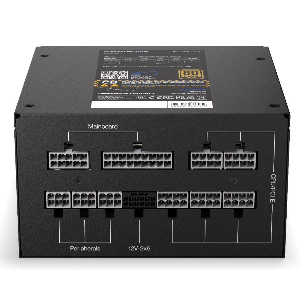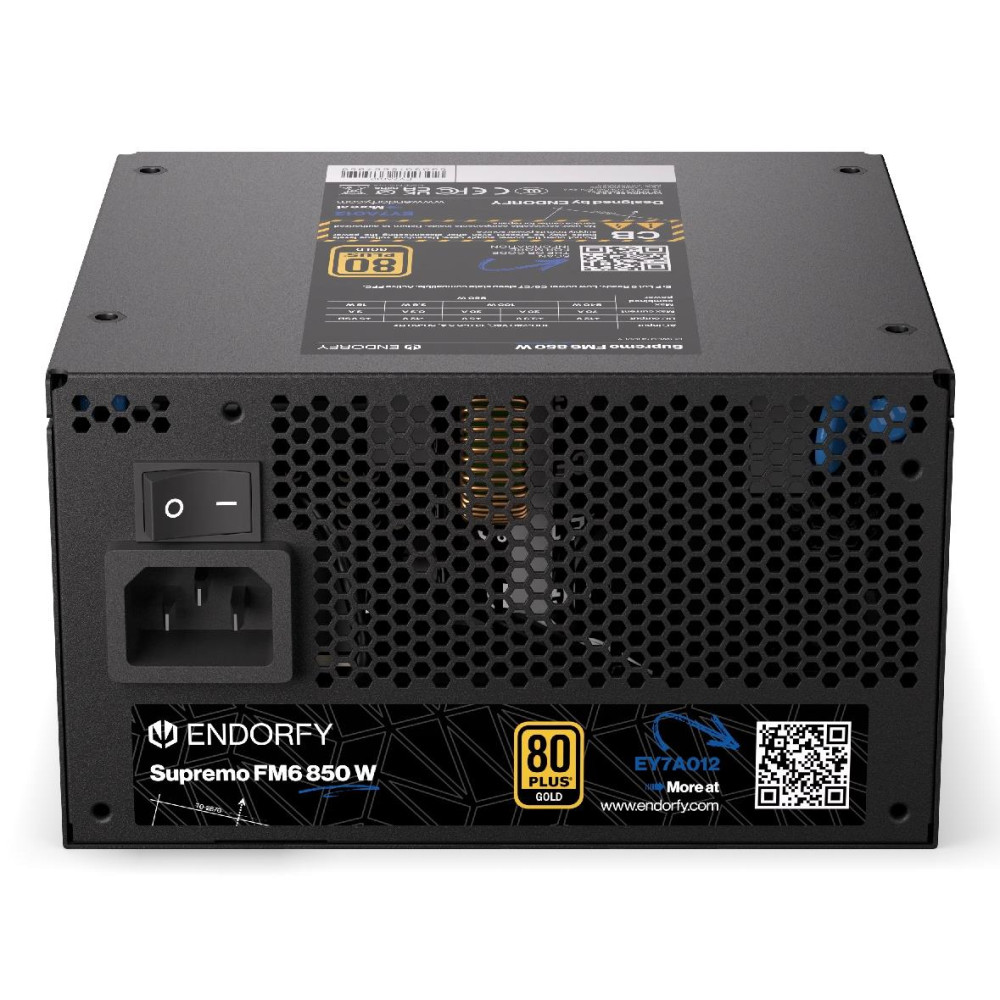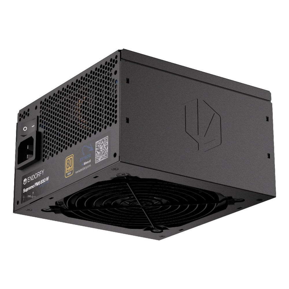 ENDORFY Supremo FM6 850 W. Общая мощность: 850 W, Входящее напряжение сети: 100 - 240 V, Частота входящего переменного тока: 50/60 Hz. Разъем питания материнской платы: 24-pin ATX, Длина кабеля питания SATA: 560 mm, Тип свивки: Fully-Modular. Предназначение: ПК, Форм-фактор блока питания (БП): ATX, 80 PLUS сертификация: 80 PLUS Gold. Цвет товара: Черный, Тип охлаждения: Aктивный, Диаметр вентилятора: 12 cm. Поставляемые кабели: Кабель переменного тока