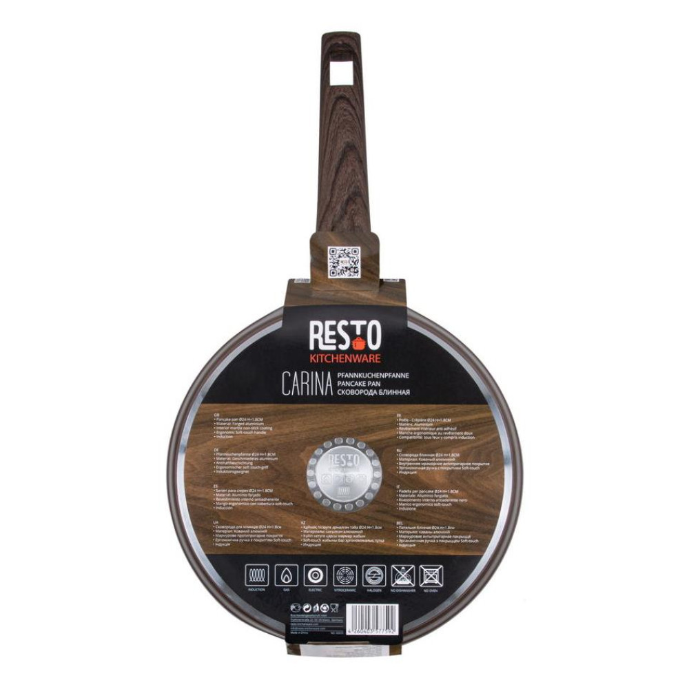 Resto Kitchenware 93025. Shape: Round, Type: Pancake pan, Product colour: Black. Diameter: 24 cm, Width: 240 mm, Depth: 440 mm. Quantity per pack: 1 pc(s), Package type: Sleeve. Doesnt contain: Perfluorooctanoic Acid (PFOA)