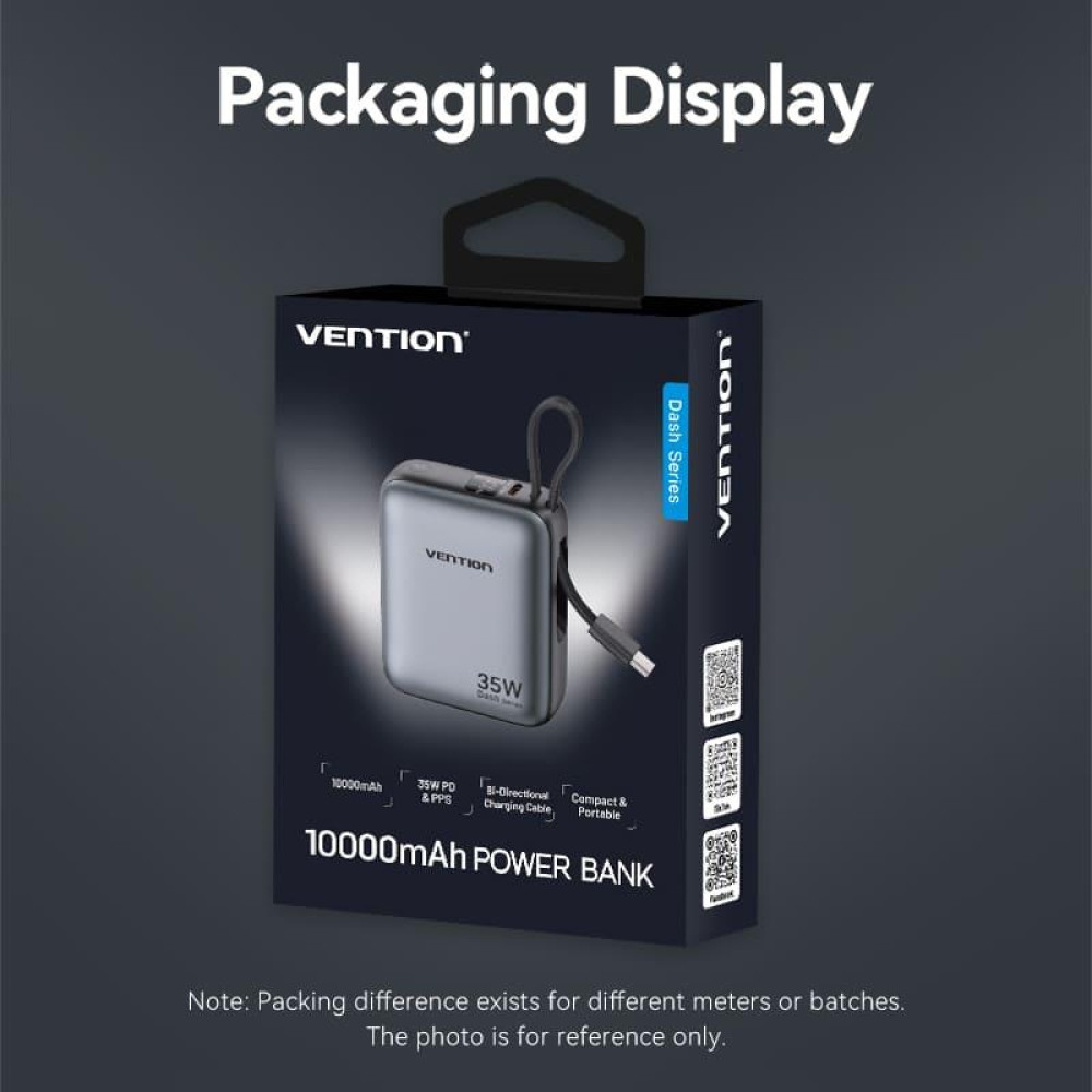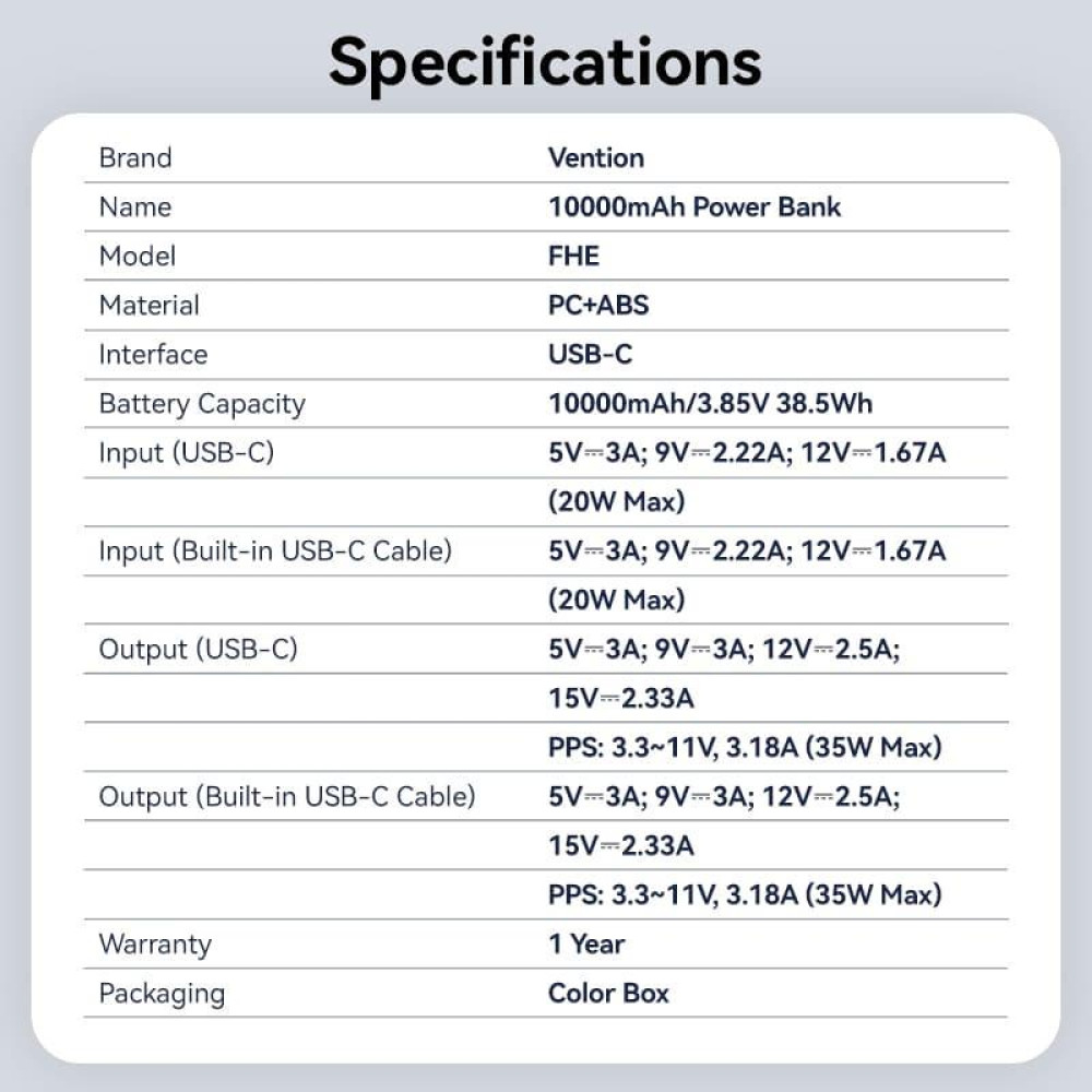 Vention FHEH0. Battery capacity: 10000 mAh, Battery technology: Lithium Polymer (LiPo), Fast charging technology: Programmable Power Supply (PPS), Battery voltage: 3.85 V. USB Type-C ports quantity: 1. Total output power: 35 W. Product colour: Black