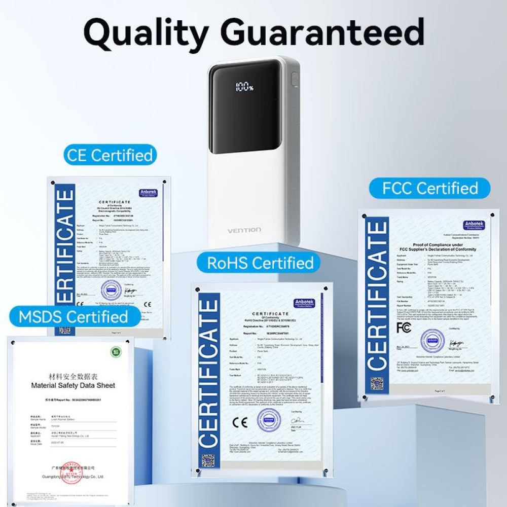 Summary Vention FHPW0. Battery capacity: 20000 mAh, Battery voltage: 3.7 V. USB Type-A output ports: 2, USB Type-C ports quantity: 1. Total output power: 22.5 W. Product colour: White