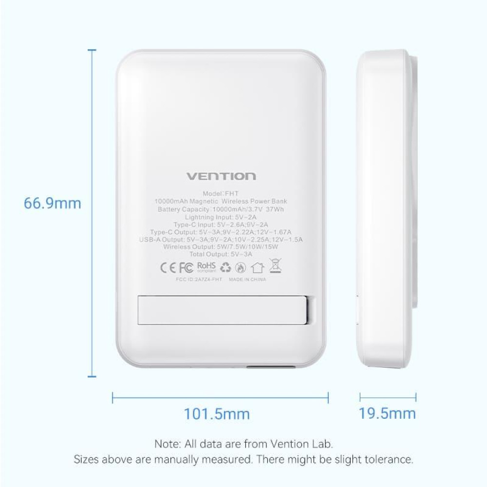 Vention FHTW0. Емкость батареи: 10000 mAh, Технология быстрой зарядки: Power Delivery, Напряжение батареи: 3,85 V. Количество выходов USB A: 1, Количество USB портов С-типа: 1. Беспроводная зарядка. Общая выходная мощность: 22,5 W, Ток на выходе: 3 A. Цвет товара: Белый