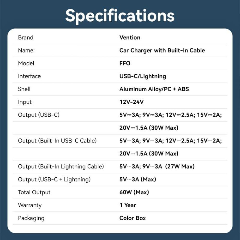 Summary Vention FFOB0. Charger type: Auto, Power source type: Cigar lighter, Charger compatibility: Universal, USB Type-C ports quantity: 1. Product colour: Black, Blue
