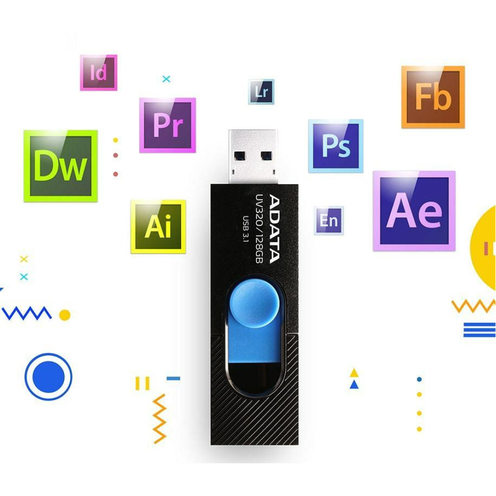 ADATA UV320. Capacity: 128 GB, Device interface: USB Type-A, USB version: 3.2 Gen 1 (3.1 Gen 1). Form factor: Slide. Weight: 7.9 g. Product colour: Black, Blue
