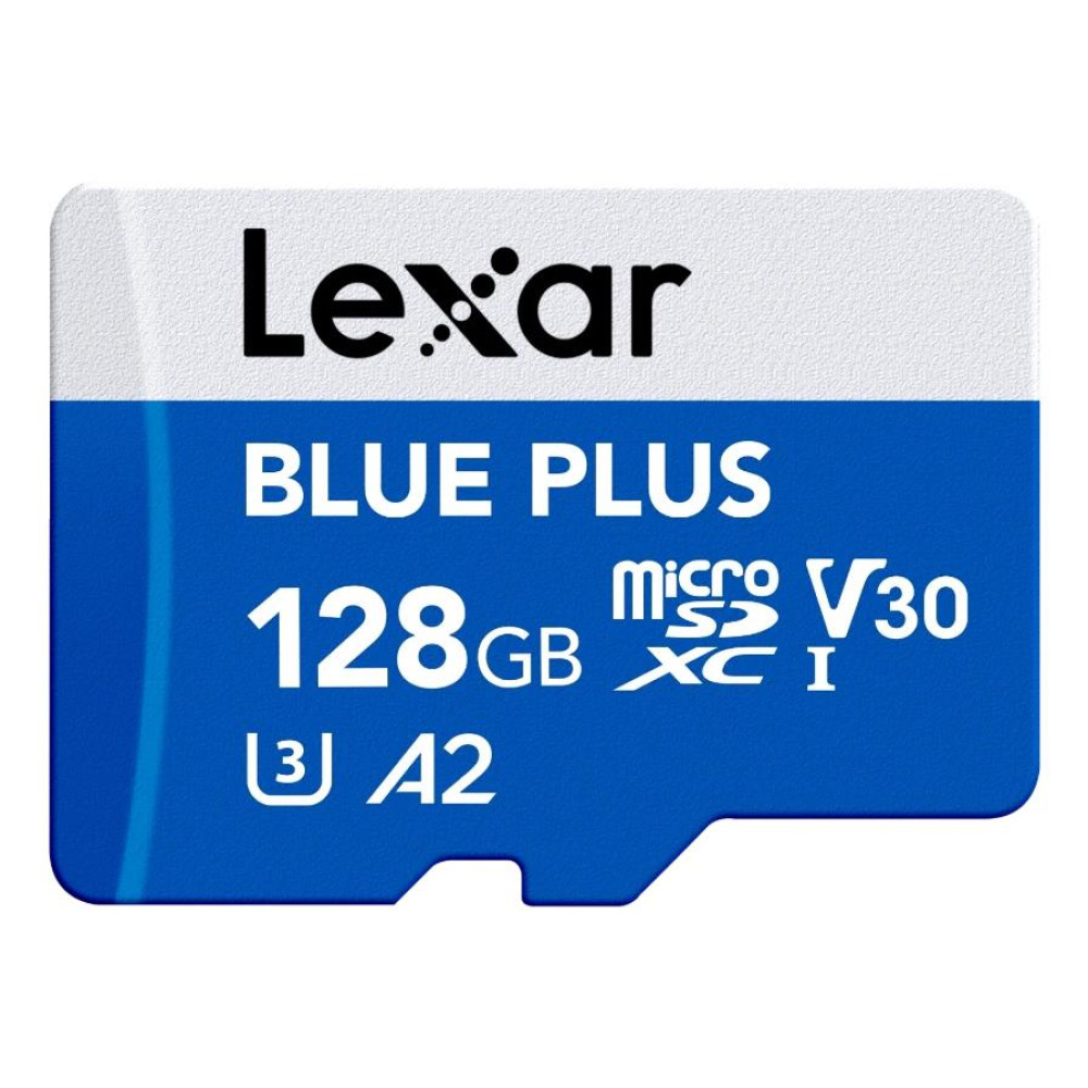 Lexar BLUE PLUS. Capacity: 128 GB, Flash card type: MicroSDXC, Internal memory type: UHS-I, Read speed: 170 MB/s, UHS Speed Class: Class 3 (U3), Video Speed Class: V30. Product colour: Blue