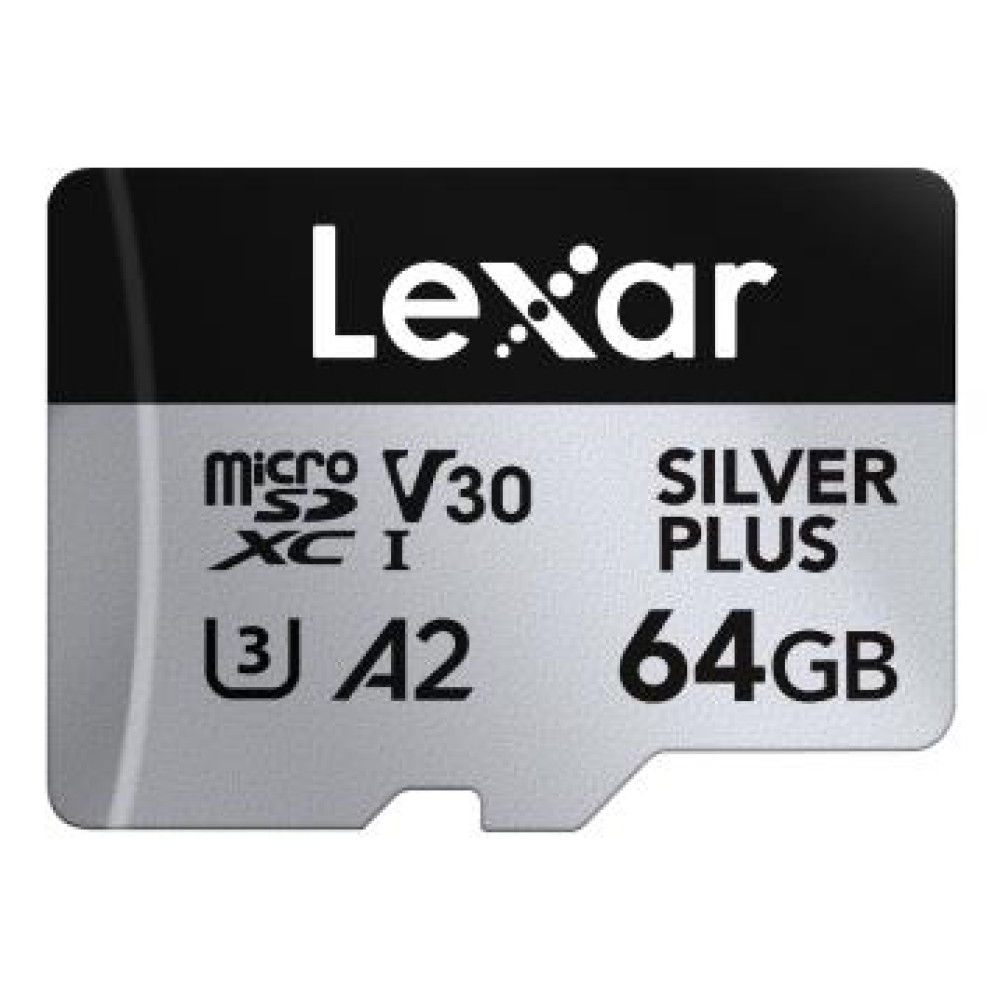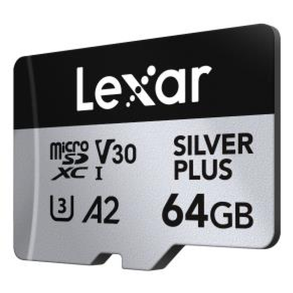 Lexar Professional SILVER PLUS. Capacity: 64 GB, Flash card type: MicroSDXC, Flash memory class: Class 3, Internal memory type: UHS-I, Read speed: 205 MB/s, Write speed: 100 MB/s, UHS Speed Class: Class 3 (U3), Video Speed Class: V30. Protection features: Temperature proof, Magnet proof, Shock resistant, X-ray proof, Impact resistant, Product colour: Black, Silver