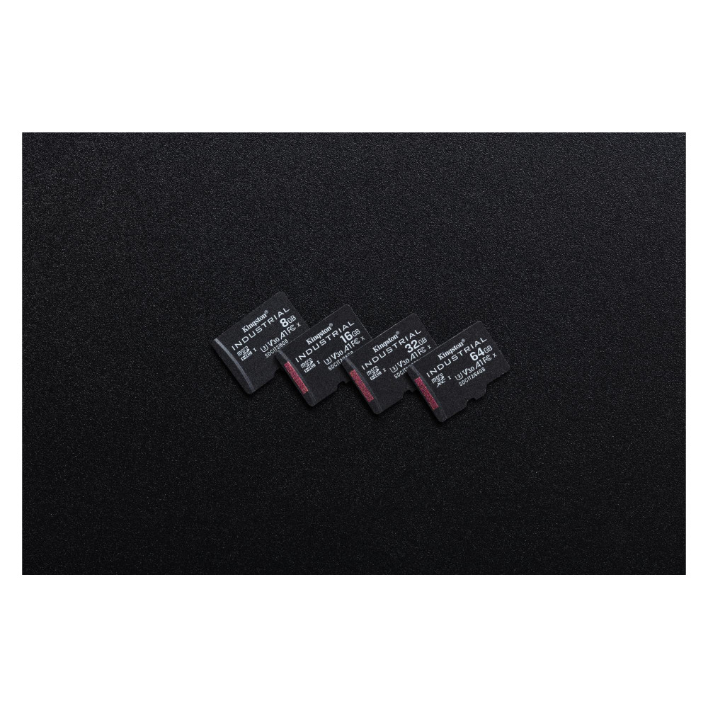 Kingston Technology 64GB microSDXC Industrial C10 A1 pSLC Card + SD Adapter. Capacity: 64 GB, Flash card type: MicroSDXC, Flash memory class: Class 10, Internal memory type: UHS-I, Read speed: 100 MB/s, Write speed: 80 MB/s, UHS Speed Class: Class 3 (U3), Video Speed Class: V30. Protection features: Temperature proof, Waterproof, X-ray proof, Product colour: Black