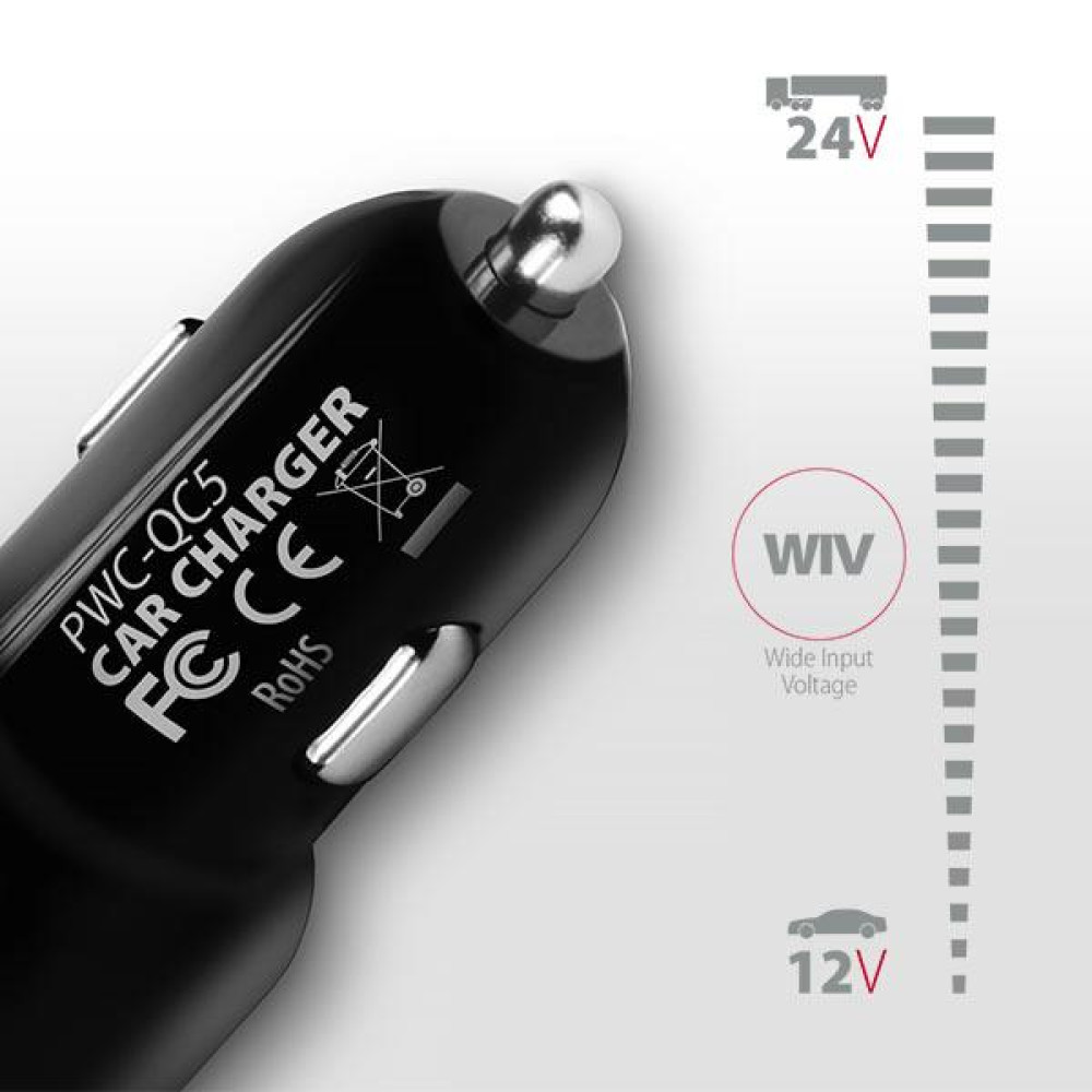 Summary Axagon PWC-QC5. Charger type: Auto, Power source type: Cigar lighter, Charger compatibility: Mobile phone, Smartphone, Tablet, Universal. Input voltage: 12 - 24 V, Maximum output voltage: 12 V. USB 2.0 ports quantity: 2, Fast charging, Power protection features: Over voltage, Overheating, Overload, Short circuit. Product colour: Black