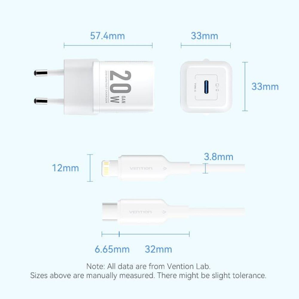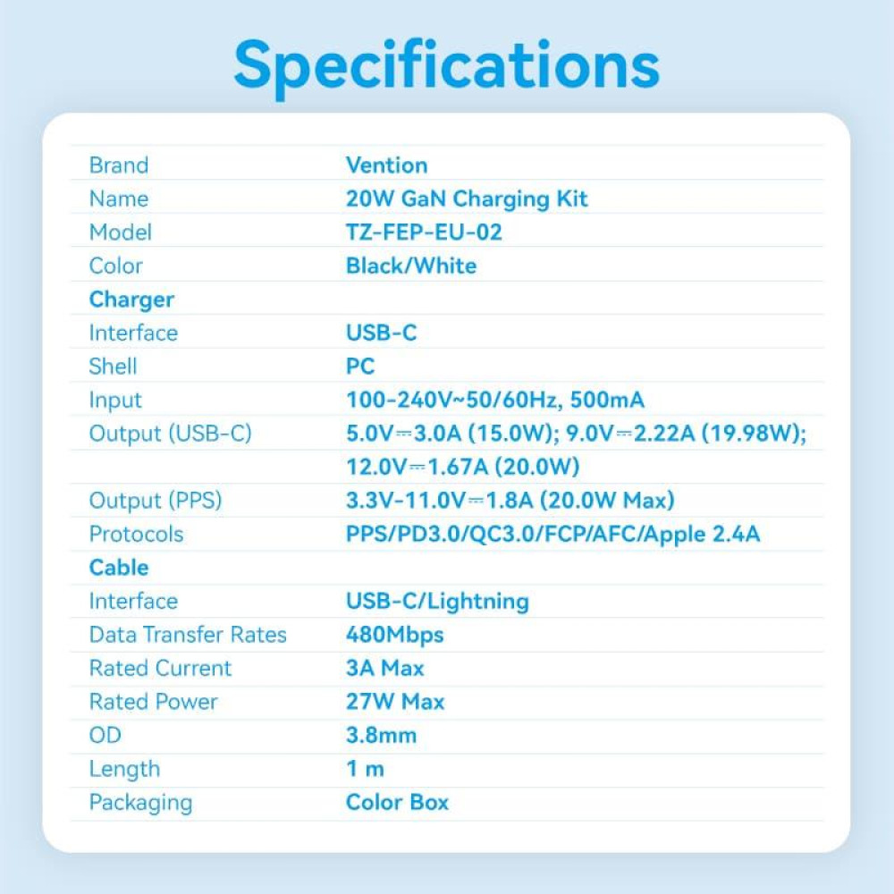 Vention 1-Port USB-C GaN Charger (20W) with USB-C to USB-C Cable. Charger type: Indoor, Power source type: AC, Charger compatibility: Universal. Input voltage: 100 - 240 V, Maximum output voltage: 12 V, AC adapter output current: 3 A. USB Type-C ports quantity: 1, Fast charging, Power protection features: Overheating, Over current, Over power, Short circuit, Over voltage. Cable length: 1 m, Product colour: White