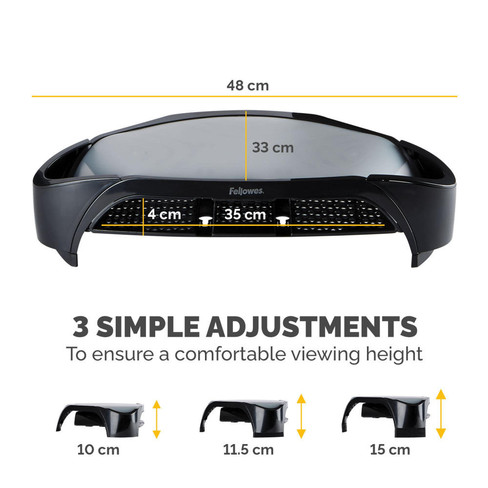 Fellowes Computer Monitor Stand with 3 Height Adjustments - Smart Suites Monitor Riser Plus with Storage Area - Ergonomic Adjustable Monitor Stand for Computers - Max Weight 10KG/Max Size 21 - Black. Mounting: Freestanding, Maximum weight capacity: 10 kg, Maximum screen size: 53.3 cm (21). Height adjustment. Product colour: Black
