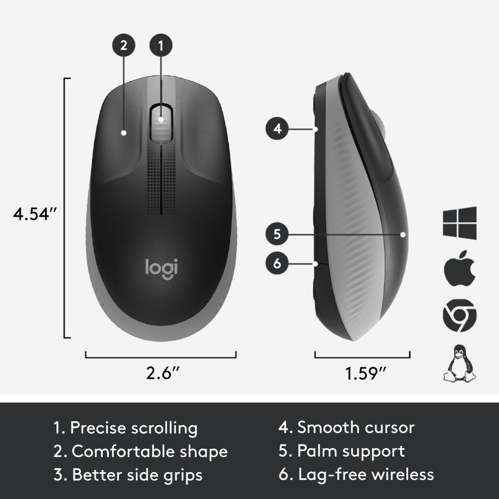 Logitech M190 Full-size wireless mouse. Form factor: Ambidextrous. Movement detection technology: Optical, Device interface: RF Wireless, Movement resolution: 1000 DPI, Buttons type: Pressed buttons, Buttons quantity: 3, Scroll type: Wheel. Power source: Batteries. Product colour: Grey