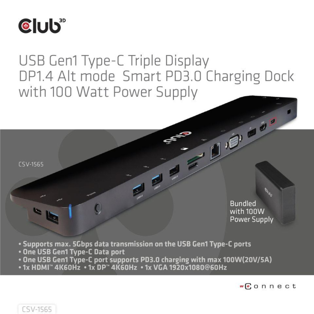 CLUB3D CSV-1565. Технология подключения: Док-разъём, Основной интерфейс: USB 3.2 Gen 1 (3.1 Gen 1) Type-C. Цвет товара: Черный. Paper/cardboard packaging weight: 239 g. Код гармонизированной системы описания (HS): 8473 3020