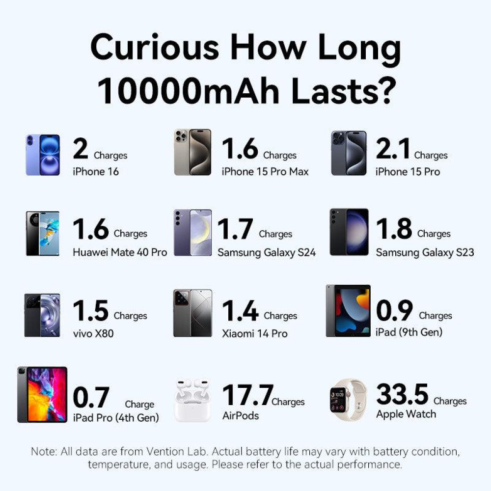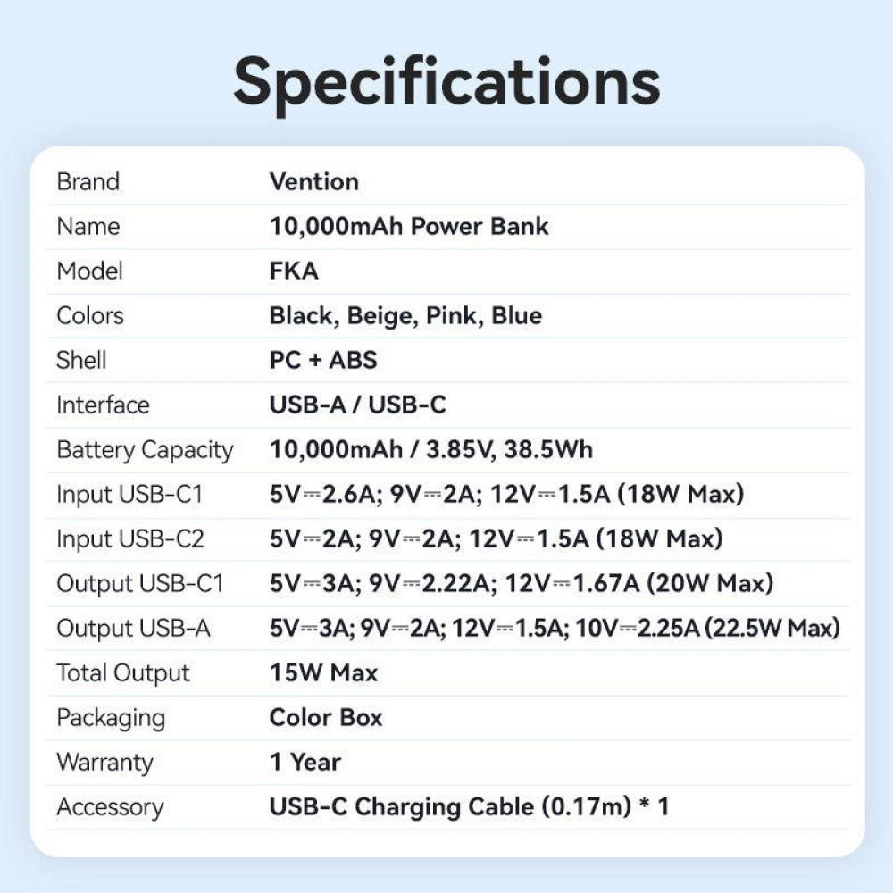 Vention 10000mAh Power Bank 22.5W. Battery capacity: 10000 mAh, Fast charging technology: Super Fast Charging, Battery voltage: 3.85 V. USB Type-A output ports: 1, USB Type-C ports quantity: 2. Product colour: Blue