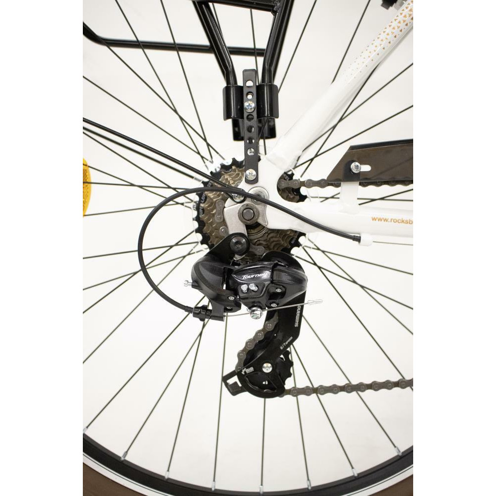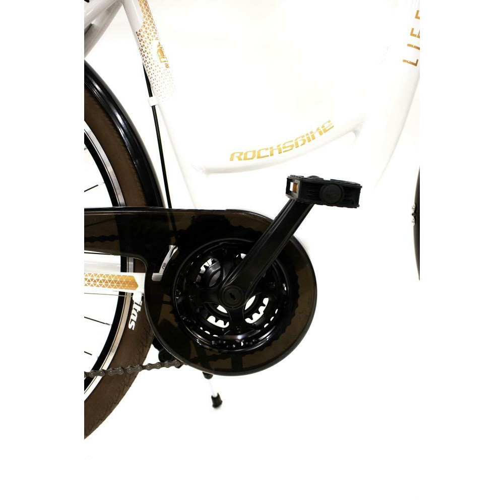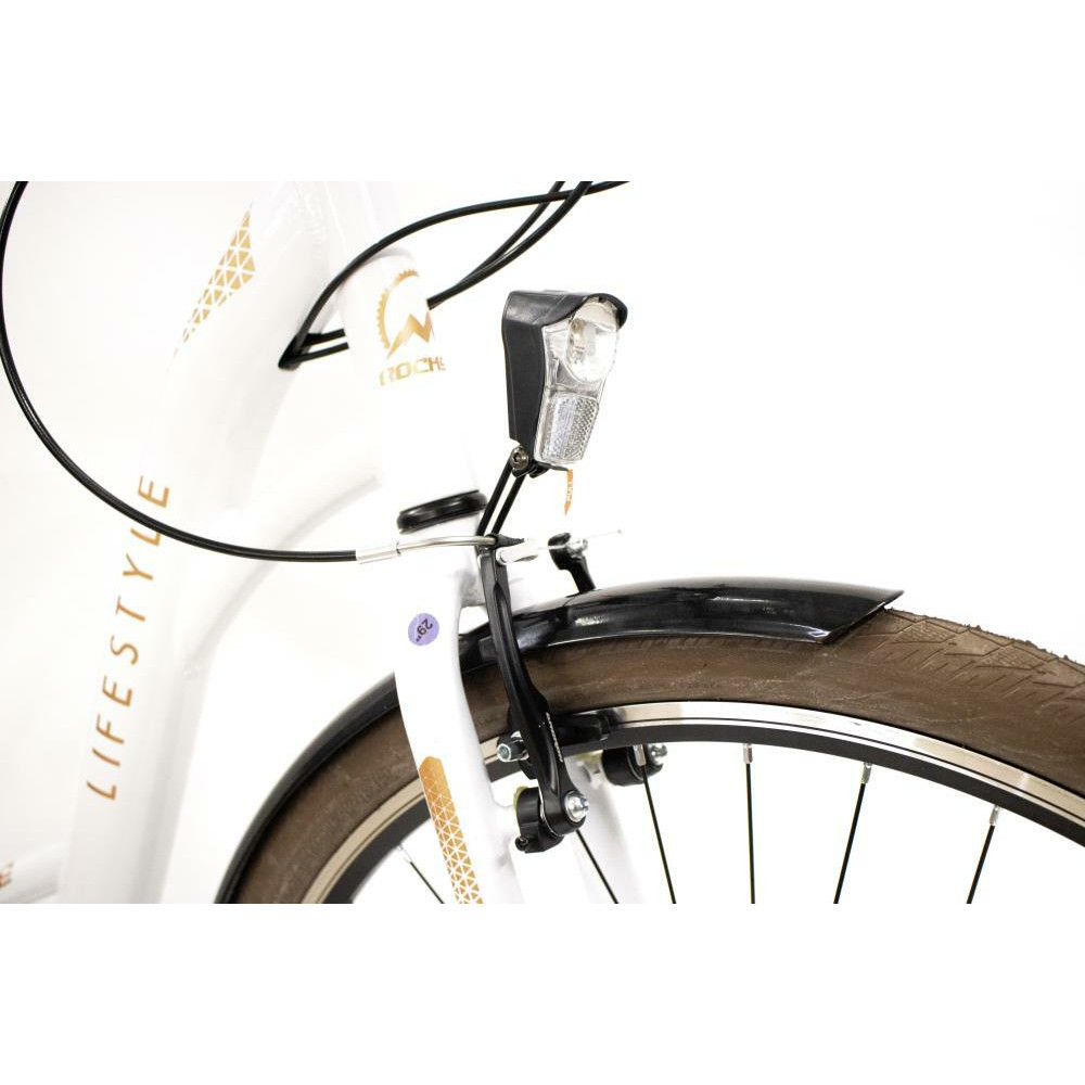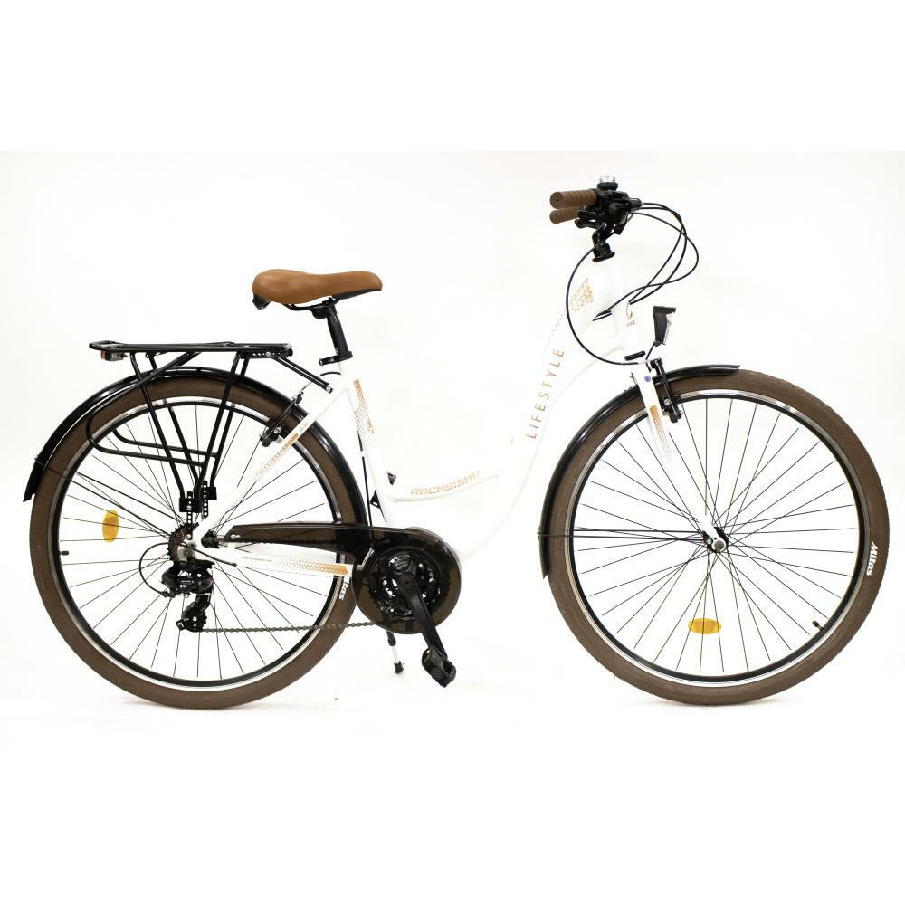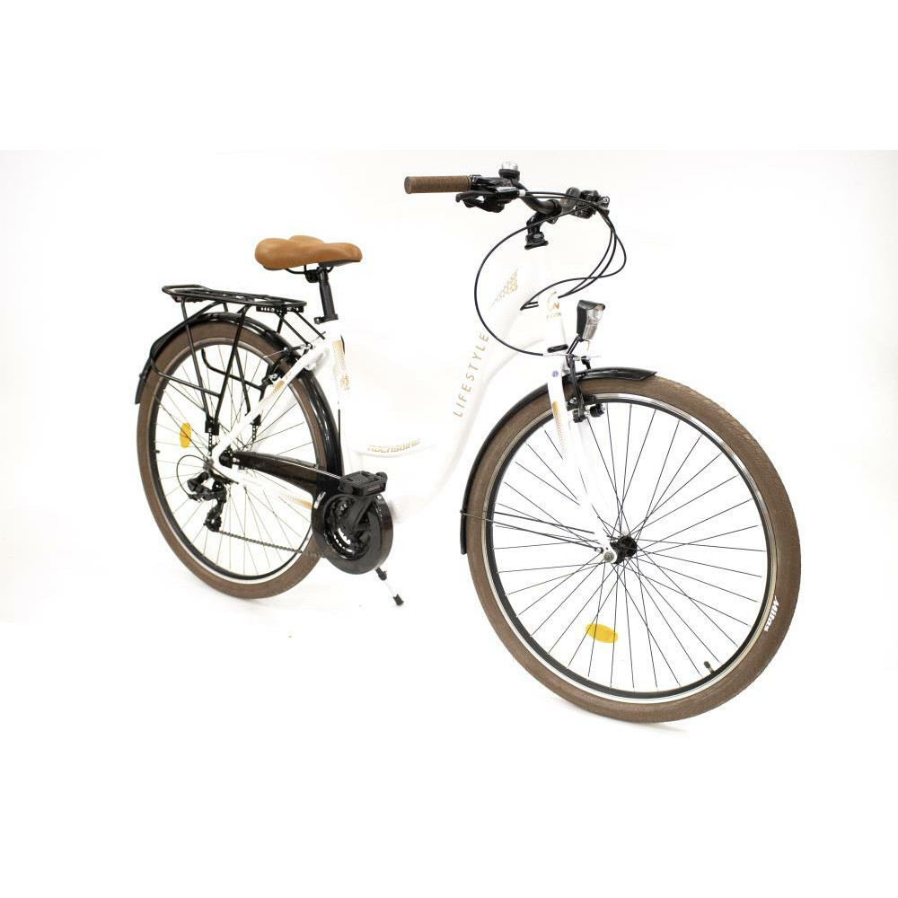 - Rocksbike Lifestyle 3.0,Adults,CTB,Wheel size 28,Number of speeds 21,Frame Alloy,Bicycle seat Steel,Brakes Aluminium V-shaped,Front gears 3,Rear gears 7,Rear derailleur SHIMANO RD-TY300 TOURNEY,Headlight/Backlight,White / Brown,Weight 16.12 kg