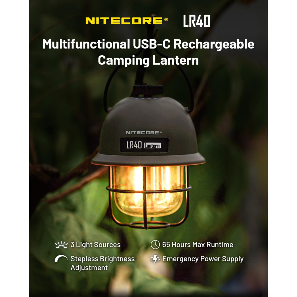 Nitecore LR40. Тип продукта: USB powered camping lantern, Цвет товара: Оливковый, Материал корпуса: АБС-пластик, Металл. Световой поток (фонарь): 100 lm, Цвет света: Красный, Белый. Тип входного USB порта: USB C. Тип источника питания: Аккумулятор, Источник зарядки: USB, Технология батареи: Литий-ионная (Li-Ion). Ширина: 117 mm, Глубина: 96 mm, Высота: 96 mm