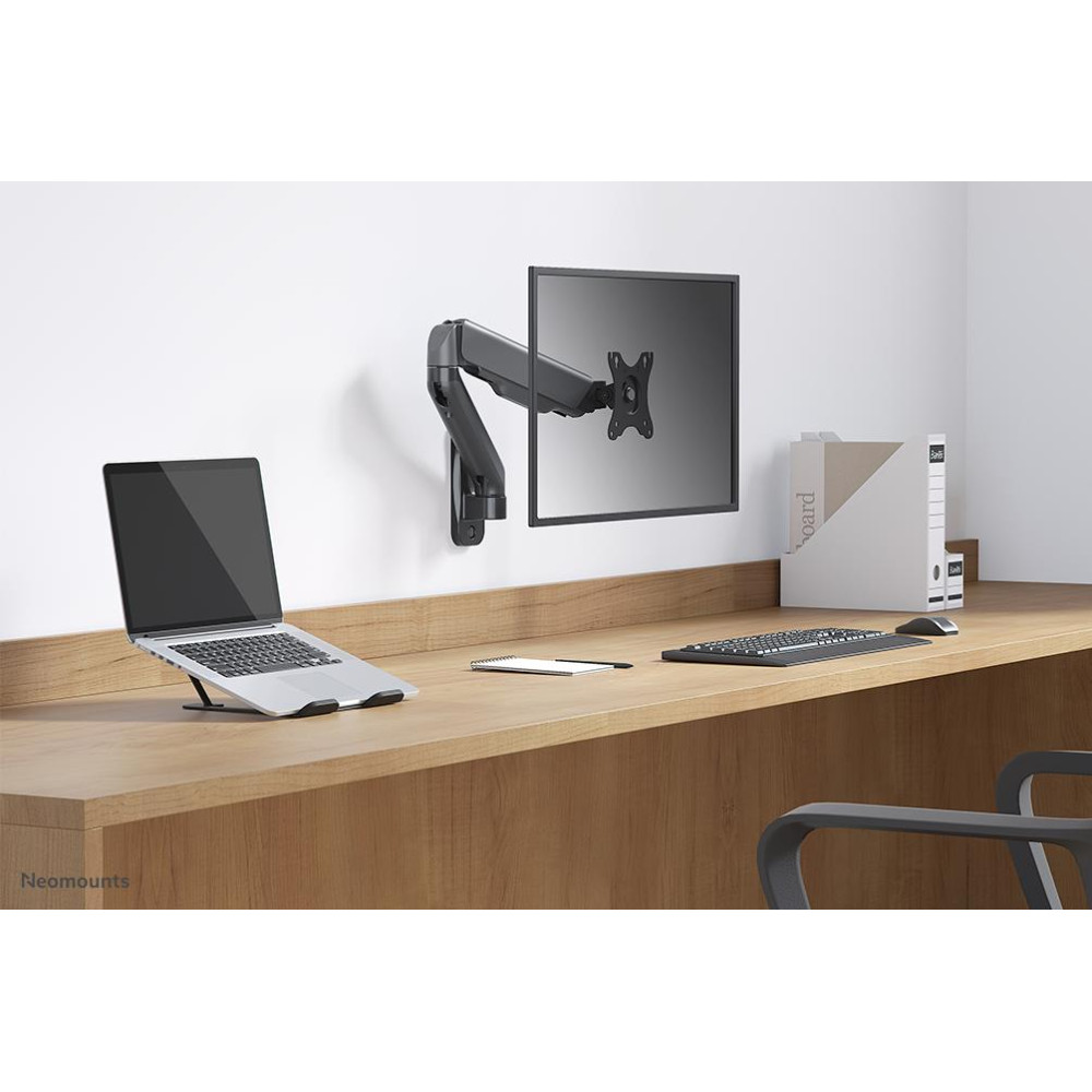 Summary Neomounts WL70-450BL11 Monitor/TV mount wall 17-32 - gas spring - full motion. Maximum weight capacity: 9 kg, Minimum screen size: 43.2 cm (17), Maximum screen size: 81.3 cm (32), Minimum VESA mount: 75 x 75 mm, Maximum VESA mount: 100 x 100 mm. Height adjustment range: 0 - 250 mm, Tilt angle range: -45 - 90°, Swivel angle range: 0 - 180°, Angle of rotation: 360°, Distance to the wall (min): 9 cm, Distance to the wall (max): 54 cm. Product colour: Black