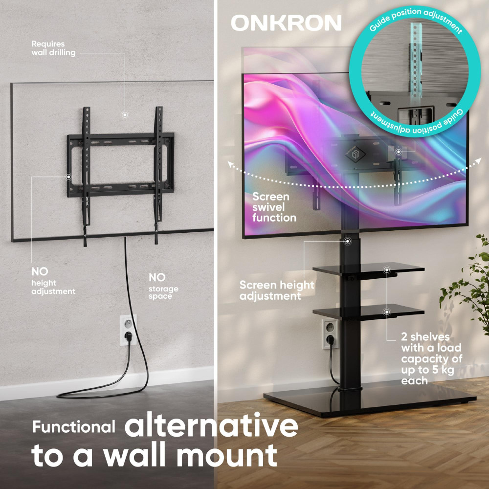 ONKRON TS5550-B. Maximum weight capacity: 30 kg, Minimum screen size: 81.3 cm (32), Maximum screen size: 165.1 cm (65), Minimum VESA mount: 100 x 100 mm, Maximum VESA mount: 600 x 400 mm. Height adjustment range: 880 - 1080 mm, Swivel angle range: -25 - 25°, Angle of rotation: 50°, Distance to the wall (max): 3.9 cm. Product colour: Black