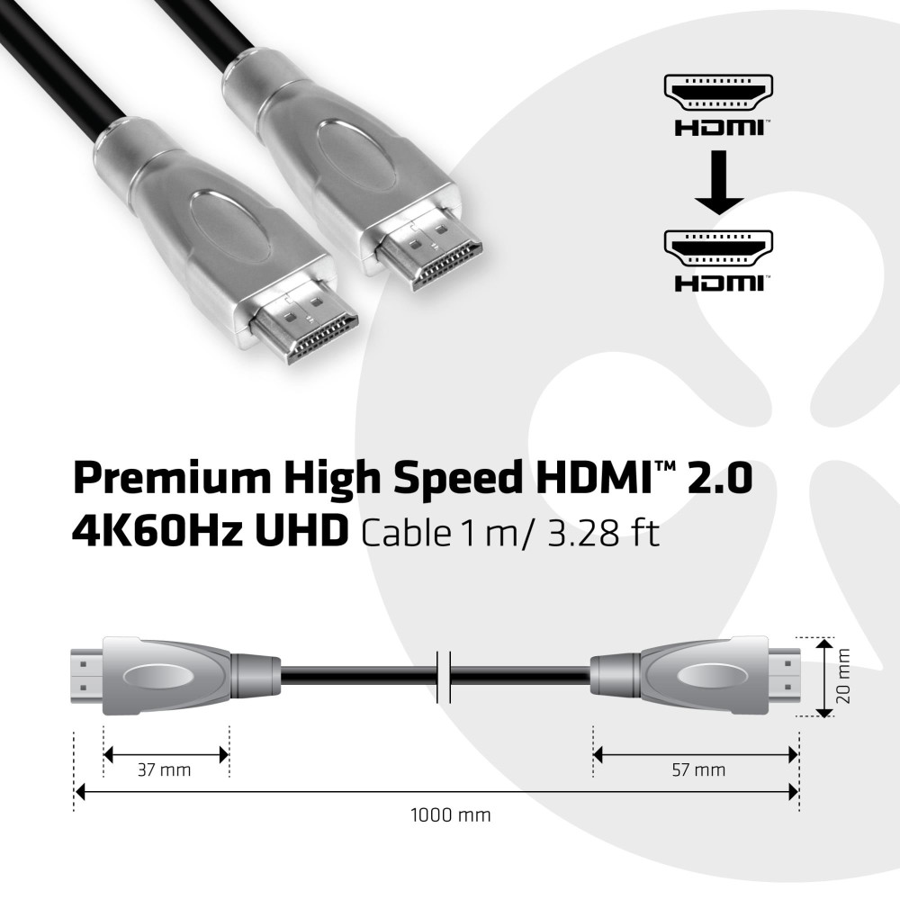 CLUB3D Premium High Speed HDMI™ 2.0 4K60Hz UHD Cable 1 m/ 3.28 ft. Cable length: 1 m, Connector 1: HDMI Type A (Standard), Connector 1 gender: Male, Connector 2: HDMI Type A (Standard), Connector 2 gender: Male, HDMI version: 2.0, 3D, Maximum resolution: 3840 x 2160 pixels, Data transfer rate: 18 Gbit/s, Product colour: Black, Silver