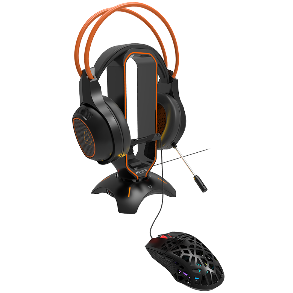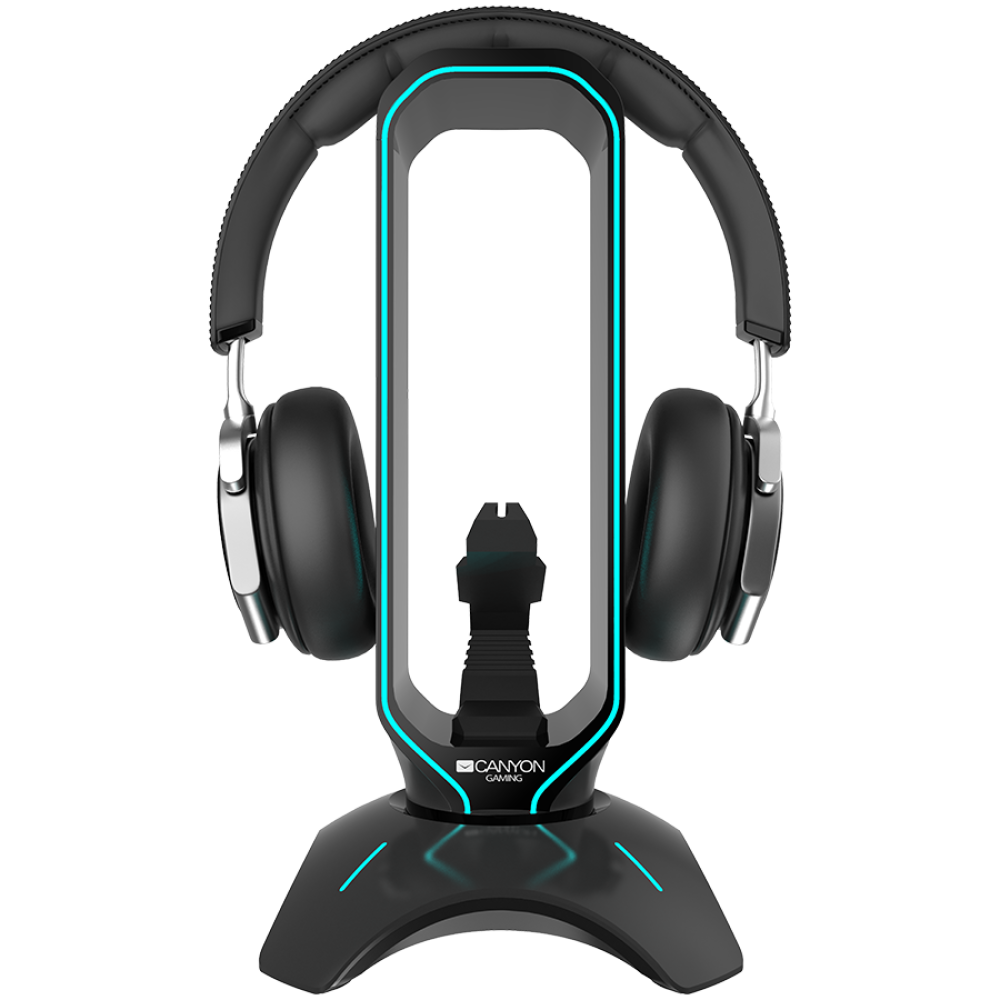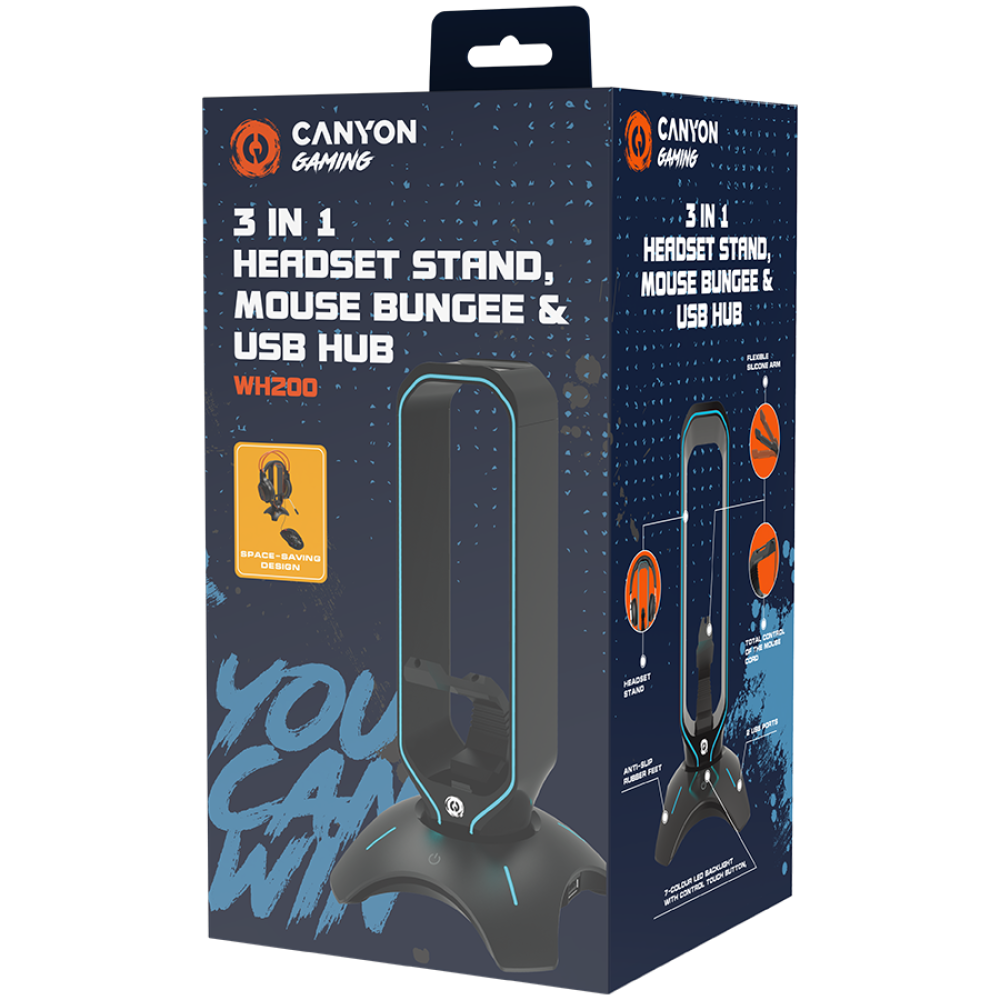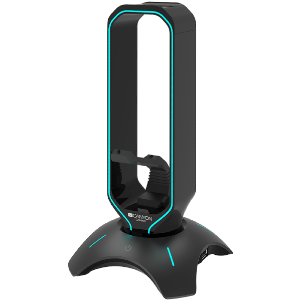 CANYON WH-200, Gaming 3 in 1 Headset stand, Bungee and USB 2.0 hub, 2 USB hub, 1.5m standard USB to USB 5mm PVC cable, Weighted design with non-slip grip, Touch switch to control LED light, Black, size:126*126*251mm, 383g