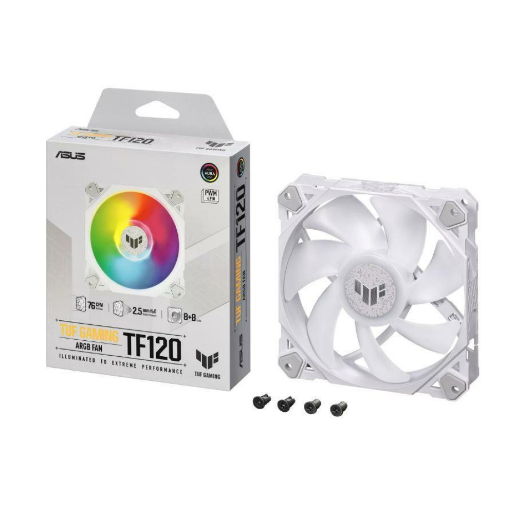 • TUF Gaming TF120 ARGB White Edition, Number of fans 1, Air flow 76 cfm, Noise level, max 29 dB, Colour White, Dimensions 120 x 120 x 25 mm