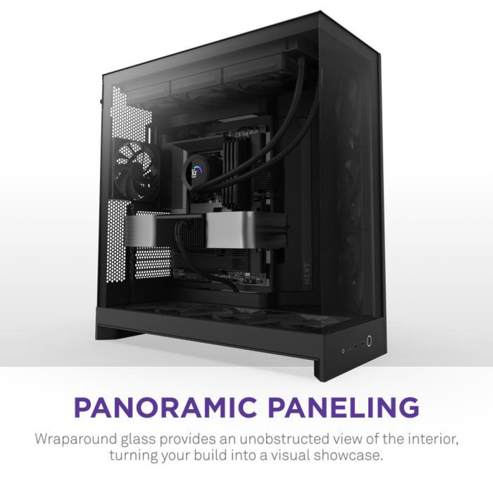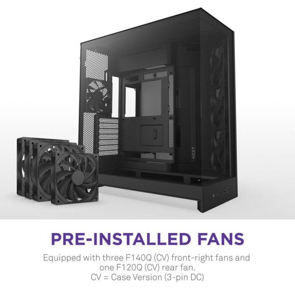 NZXT H9 Flow. Form factor: Midi Tower, Type: PC, Product colour: Black. Front fans installed: 3x 140 mm, Front fans diameters supported: 120,140 mm, Rear fans installed: 1x 120 mm. Supported HDD sizes: 2.5,3.5". Width: 315 mm, Depth: 481 mm, Height: 506 mm