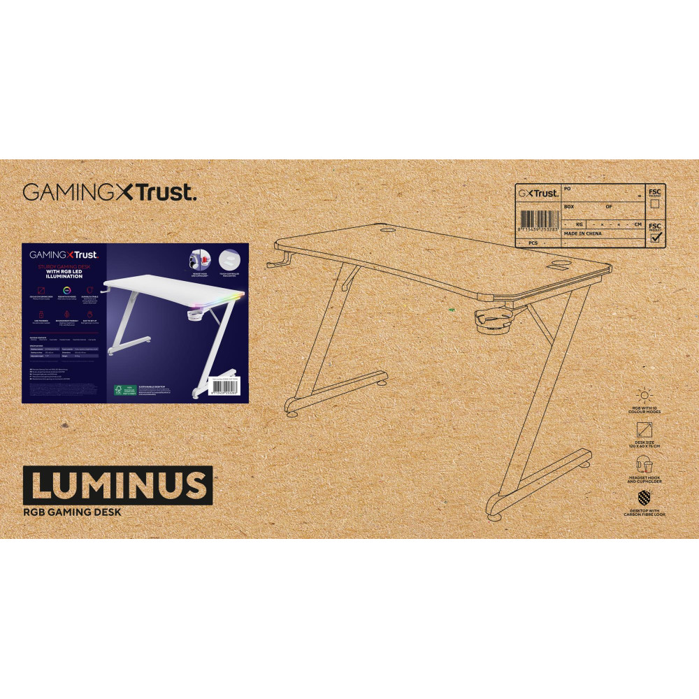 Trust GXT 709W LUMINUS. Type: Straight, Table top shape: Rectangular shape, Table top material: Wood. Width: 1200 mm, Depth: 600 mm, Height: 740 mm. Warranty period: 2 year(s)