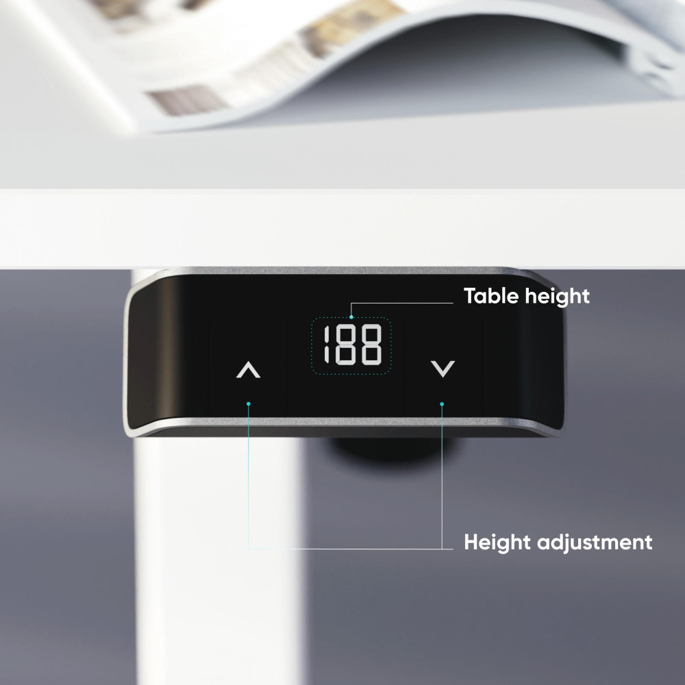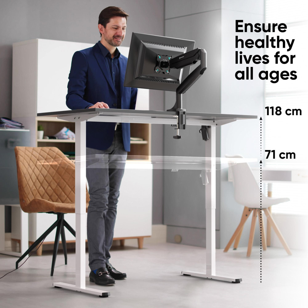 ONKRON WDF221E-W. Maximum weight capacity: 70 kg, Height adjustment type: Electric, Maximum speed: 25 mm/sec. Minimum height: 71 cm, Maximum height: 118 cm. Package width: 1044 mm, Package depth: 375 mm, Package height: 105 mm. AC adapter input voltage: 100-240 V