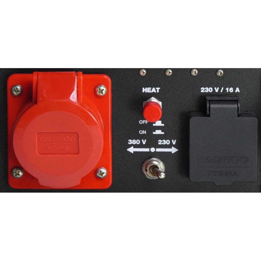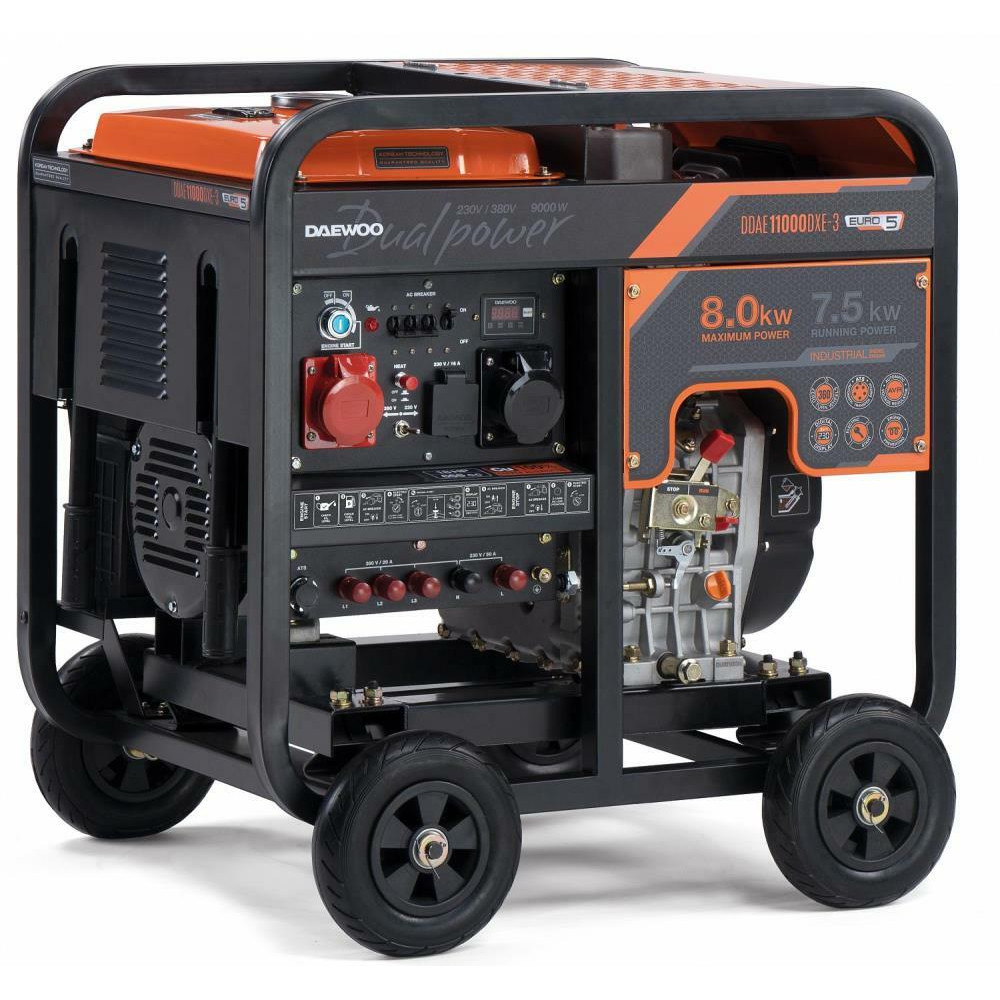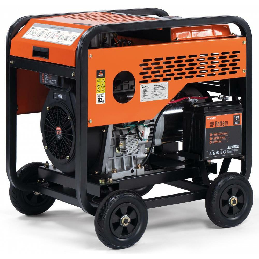 - Diesel Generator DAEWOO DDAE 11000DXE-3 - Daewoo Diesel engine - Phase selector switch (230V/380V) - Stable running and up to 15% fuel economy - ATS - automatic transfer switch - AVR (Automatic Voltage Regulator) - Copper alternator winding - The over-current smart protection - Convenient key start - Low-oil level shutdown - Automatic air lock removal system - Engine warm-up - Multifunctional display - Sturdy frame - Steel fuel tank - Transportation wheels with bearings