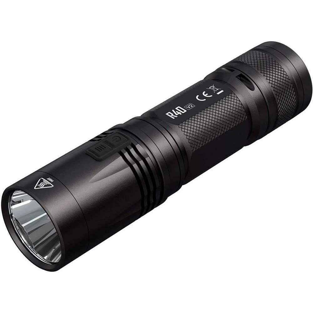 - The Nitecore R40 V2 torch is an updated version of the popular R40, offering a maximum output of 1200 lumens from the Cree XP-L2 V6 LED and is powered by a dedicated 21700 li-ion battery. As with other flashlights in the Nitecore R Series, the R40 V2 offers wireless charging for convenient use, especially for law enforcement applications. The torch comes with both a wall mount and desktop cradle which can be connected to a power source or cigarette lighter to initiate the charging process. Alternatively, the updated R40 can be charged via the USB-C port at the base of the light.The R40 V2 features five brightness levels, ranging from 1 to 1200 lumens, plus three special modes, beacon, strobe and SOS. All the outputs are accessed using a dual side switch for fast, intuitive operation. Additionally, the turbo mode can be accessed directly by long pressing the mode switch when the light is off. The side buttons also have a built-in battery indicator which flashes the battery voltage when the battery is inserted or when the mode button is pressed.To avoid accidental activation, the Nitecore R40 V2 has two lockout options. Either press and hold both side switches simultaneously or as a long term solution, remove the battery and store separately. Brightness Levels:Turbo: 1200 lumens - 2 hrs 15 mins runtimeHigh: 480 lumens - 5 hrs runtimeMid: 220 lumens - 11 hrs 30 mins runtimeLow: 50 lumens - 48 hrs runtimeUltralow: 1 lumen - 1200 hrs runtimePlus Strobe, SOS and Beacon (1200 lumens).Maximum beam distance 344 meters, waterproof to IP68 and resistant to impacts up to 1 meter.Includes: Nitecore NL2150DW 21700 dedicated battery for R40 V2, desktop cradle, wall mount cradle, car adapter, AC adapter, USB-C charging cable, holster, lanyard, spare o-ring.