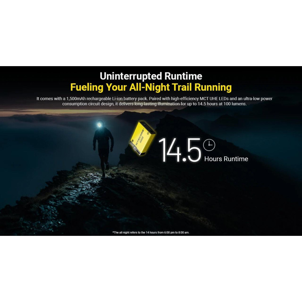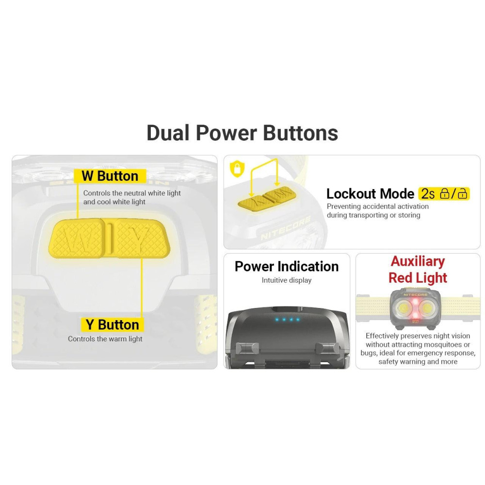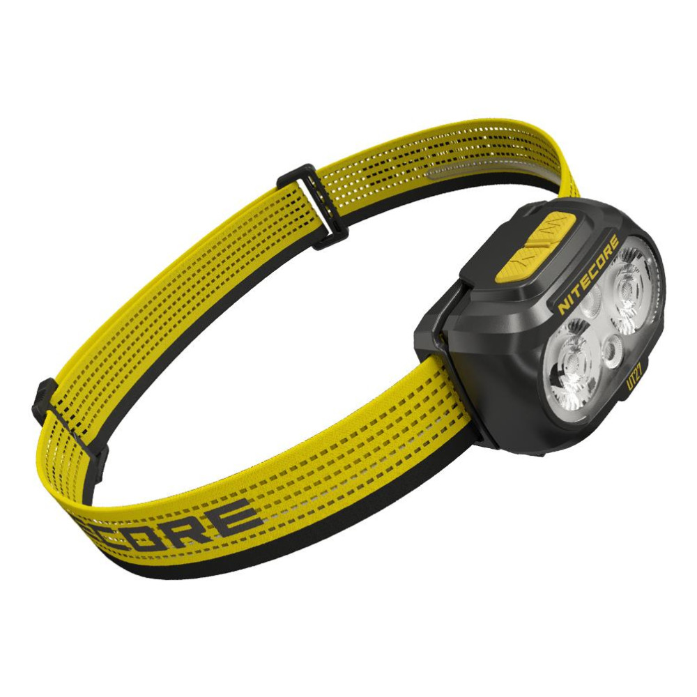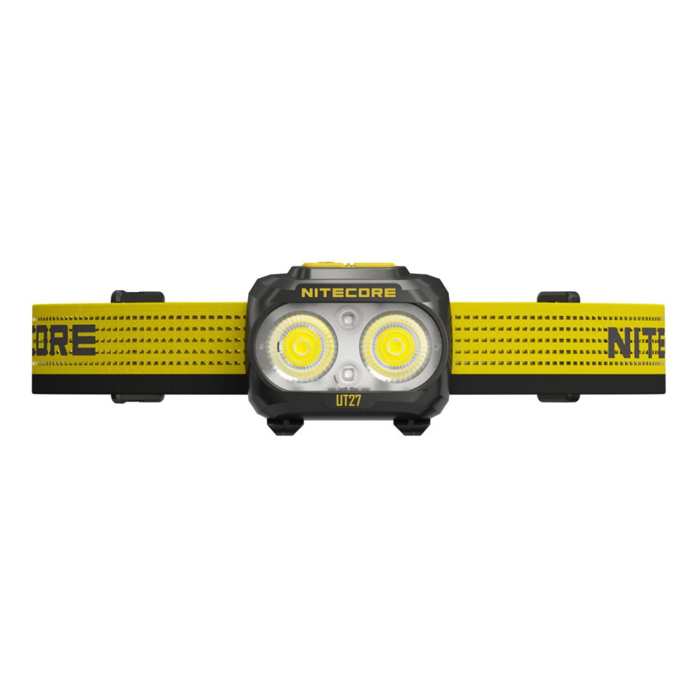 Summary Nitecore UT27 MCT. Flashlight type: Headband flashlight, Product colour: Black, Yellow, Control type: Buttons. Shockproof up to: 1 m, International Protection (IP) code: IP66. Lamp type: LED, Lamps quantity: 2 lamp(s), Luminous flux: 800 lm. Charging source: USB, Battery type: Built-in battery/AAA, Battery capacity: 1500 mAh. Width: 56 mm, Depth: 32 mm, Height: 46.6 mm