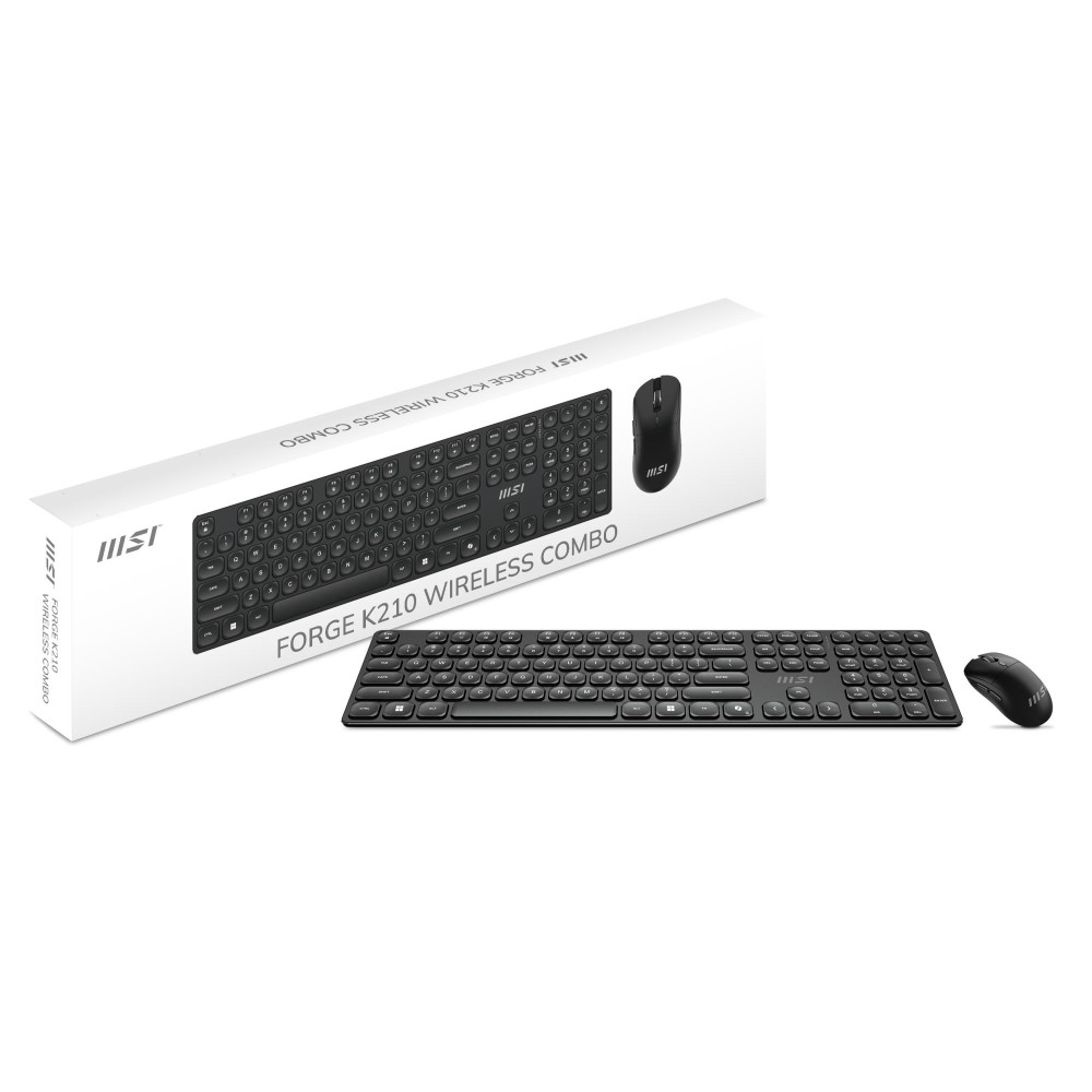MSI FORGE K210 WIRELESS COMBO. Keyboard form factor: Full-size (100%), Connectivity technology: Wireless, Device interface: USB, Keyboard key switch: Mechanical, Keyboard layout: QWERTY, Recommended usage: Home/Office. Product colour: Black. Mouse included