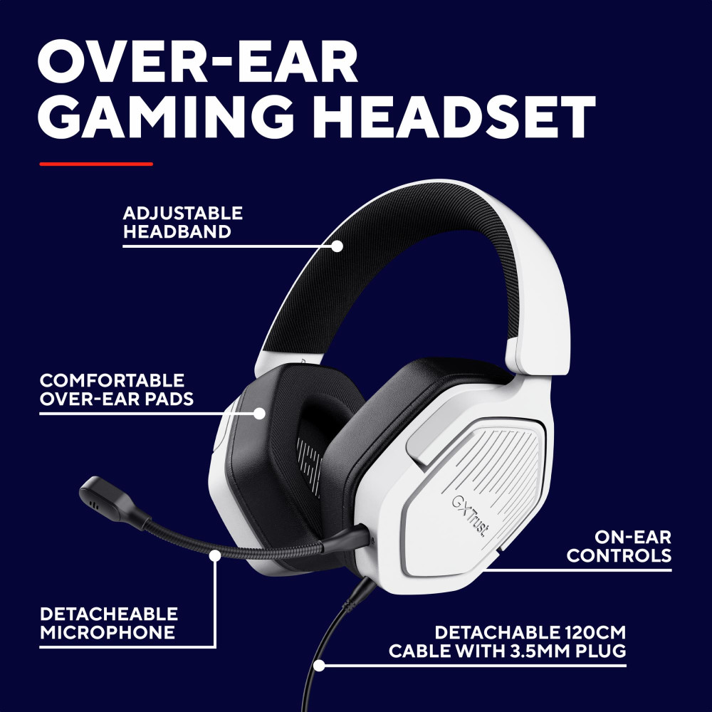 Summary Trust GXT492W Carus. Product type: Headset. Connectivity technology: Wired. Recommended usage: Gaming. Headphone frequency: 20 - 20000 Hz. Cable length: 1.2 m. Weight: 284 g. Product colour: White