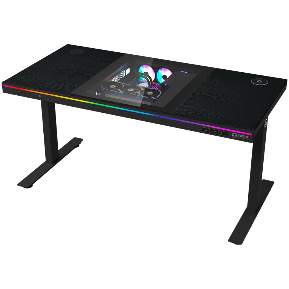 Dual-motor sit/stand adjustable-height gaming desk with built-in PC case, wireless charger, RGB lighting, control panel, and USB ports, PB melamine surface tabletop, black.