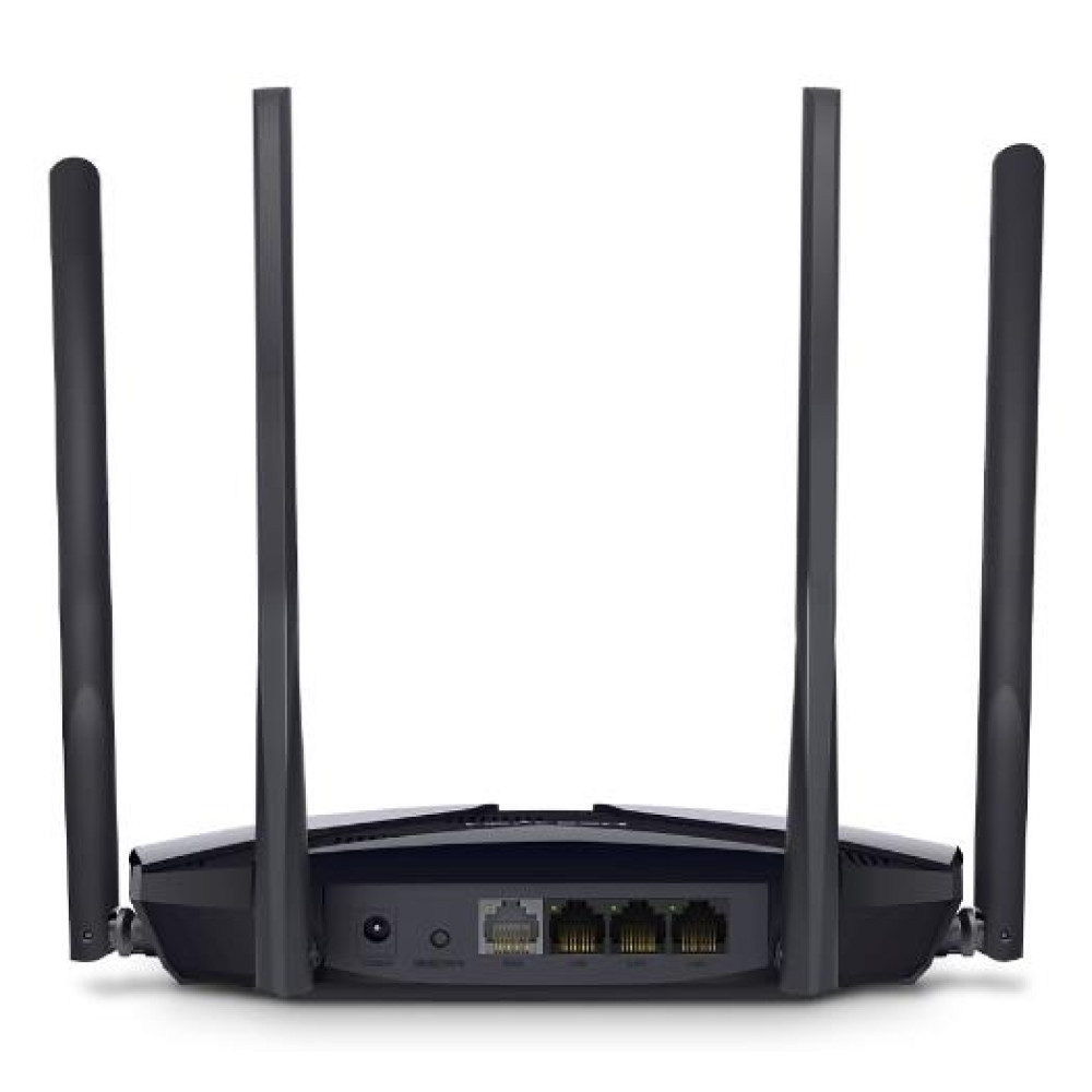 Mercusys AX3000 Dual-Band Wi-Fi 6 Router. WAN connection type: RJ-45. Wi-Fi band: Dual-band (2.4 GHz / 5 GHz), Top Wi-Fi standard: Wi-Fi 6 (802.11ax), WLAN data transfer rate (max): 3000 Mbit/s. Ethernet LAN interface type: Gigabit Ethernet, Ethernet LAN data rates: 10,100,1000 Mbit/s, Cabling technology: 10/100/1000Base-T(X). Security algorithms: WEP, WPA, WPA2, WPA3, Firewall security: SPI Firewall, IP and MAC Address Binding, NAT functionality: Port Forwarding, Port Triggering, UPnP, DMZ. Product type: Tabletop router, Product colour: Black, LED indicators: LAN, WAN