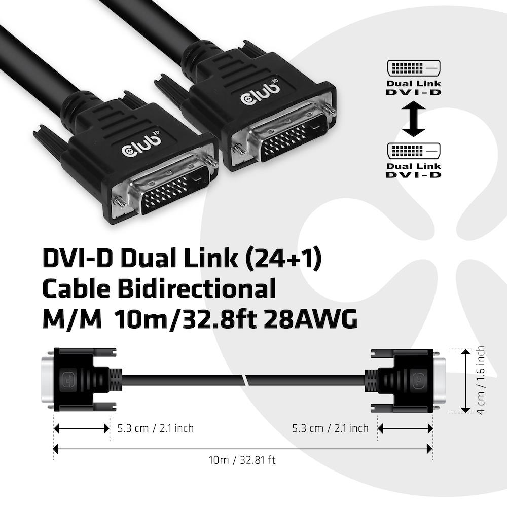 Summary CLUB3D DVI-D Dual Link (24+1) Cable Bidirectional M/M 10m/32.8ft 28AWG. Cable length: 10 m, Connector 1: DVI-D, Connector 2: DVI-D. Compliance certificates: RoHS, Certification: ROHS, FCC, and CE EMI requirements. Weight: 850 g. Quantity per pack: 1 pc(s), Package width: 210 mm, Package depth: 210 mm. Depth: 40 mm, Height: 15 mm, Width: 53 mm