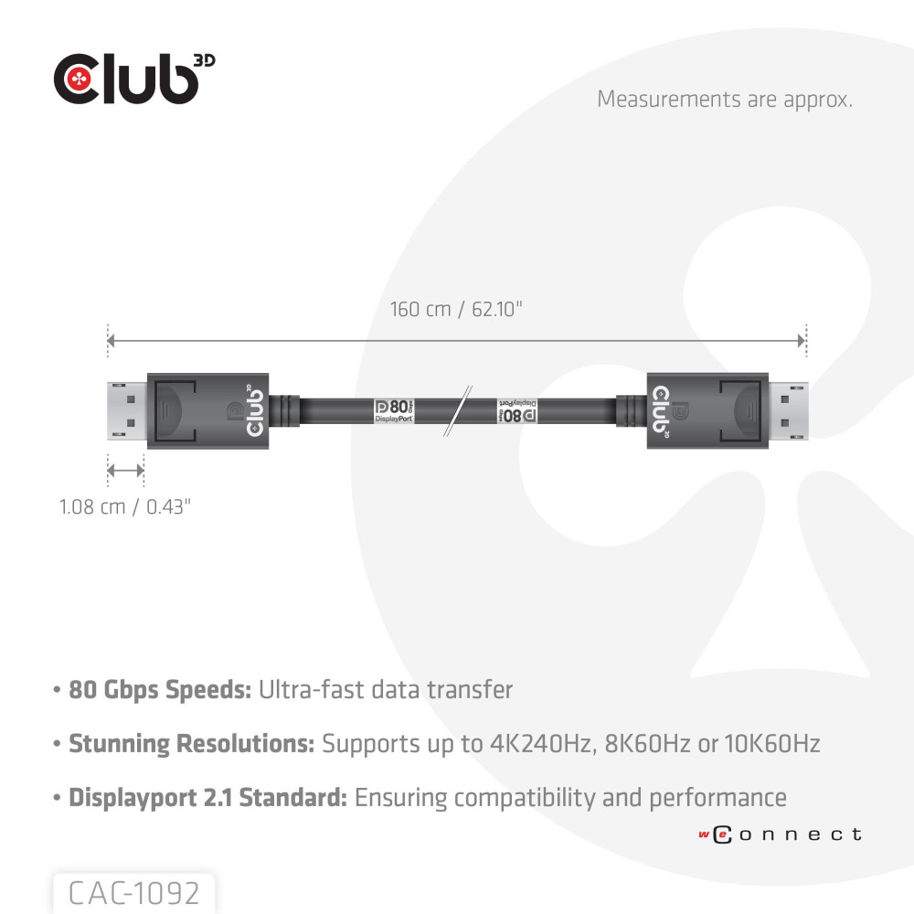 CLUB3D DisplayPort™ 2.1 Bi-Directional VESA DP80 Certified Cable 4K240Hz, 8K60Hz or 10K60Hz M/M 1.6m/5.25ft. Cable length: 1.6 m, Connector 1: DisplayPort, Connector 2: DisplayPort. Weight: 166 g. Package width: 175 mm, Package depth: 45 mm, Package height: 175 mm. Quantity per pack: 1 pc(s). Harmonized System (HS) code: 8544 4290