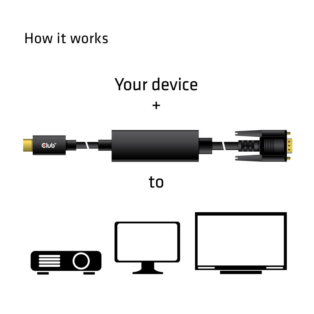 CLUB3D USB Type C to VGA Active Cable M/M 5m/16.40ft. Cable length: 5 m, Connector 1: USB Type-C, Connector 2: VGA (D-Sub). Certification: ROHS, FCC, and CE EM. Plastic packaging weight: 5 g, Paper/cardboard packaging weight: 62 g. Weight: 245 g, Width: 350 mm, Depth: 5000 mm. Package width: 145 mm, Package depth: 145 mm, Package height: 60 mm