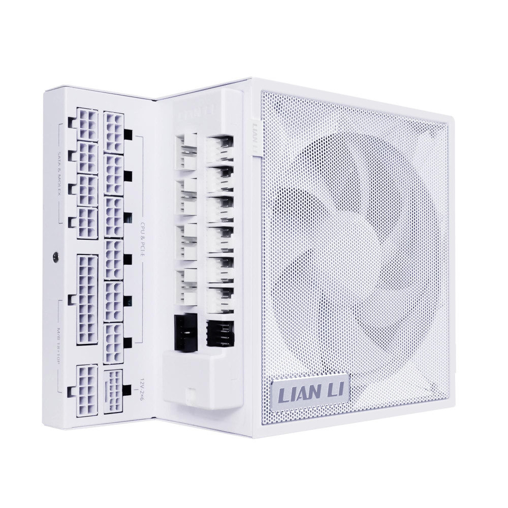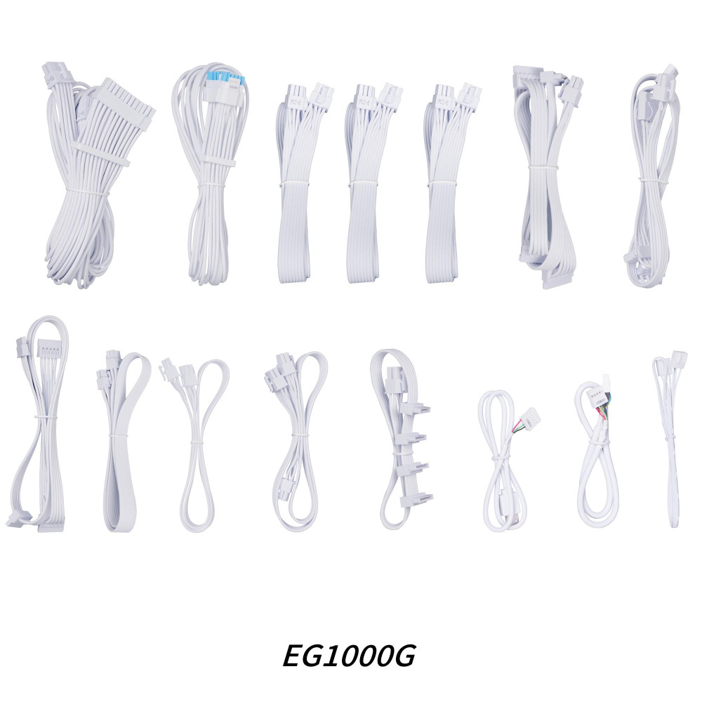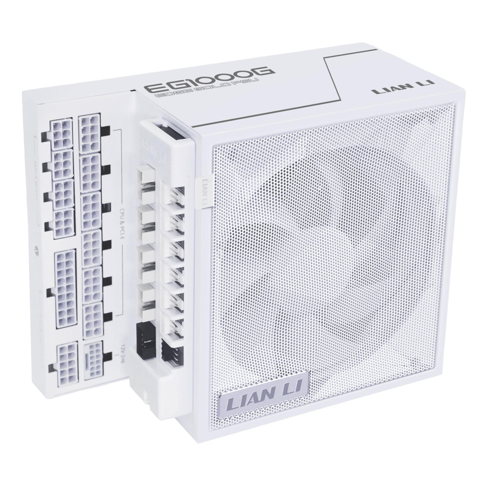 Lian Li EG1000G. Total power: 1000 W, AC input voltage: 100 - 240 V, AC input frequency: 50/60 Hz. Motherboard power connector: 20+4 pin ATX, Motherboard power cable length: 50 cm, SATA power cable length: 300,400 mm. Purpose: PC, Power supply unit (PSU) form factor: ATX, 80 PLUS certification: 80 PLUS Platinum. Product colour: White, Fan diameter: 12 cm. Cables included: CPU, PCIe, Peripheral (Molex), SATA