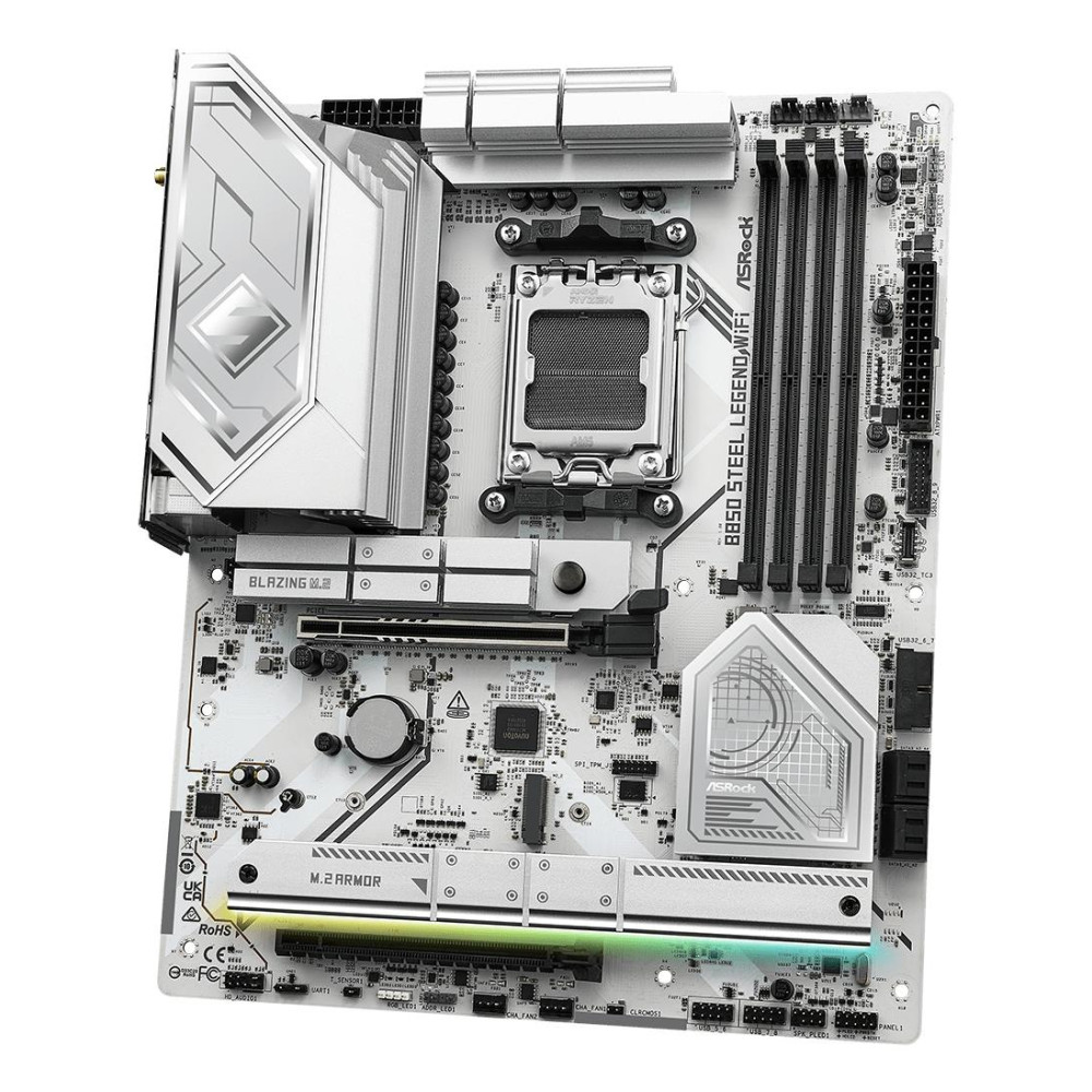 Asrock B850 Steel Legend WiFi. Производитель процессора: AMD, Сокет процессора: Socket AM5, Совместимые серии процессоров: AMD Ryzen 7000 Series, AMD Ryzen 8000 Series, AMD Ryzen 9000 Series. Поддерживаемые типы памяти: DDR5-SDRAM, Максимальная внутренняя память: 256 GB, Тип слотов памяти: DIMM. Поддерживаемые интерфейсы носителя: PCI Express 4.0, PCI Express 5.0, SATA III, Поддерживаемые типы накопителей: HDD & SSD, Уровни RAID: 0, 1, 10. Максимальное разрешение: 3840 x 2160 пикселей. Тип USB коннектора: USB тип-A, USB Type-C