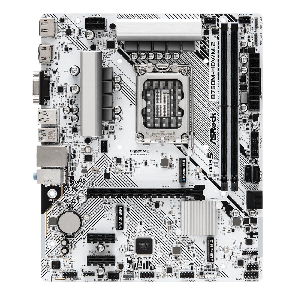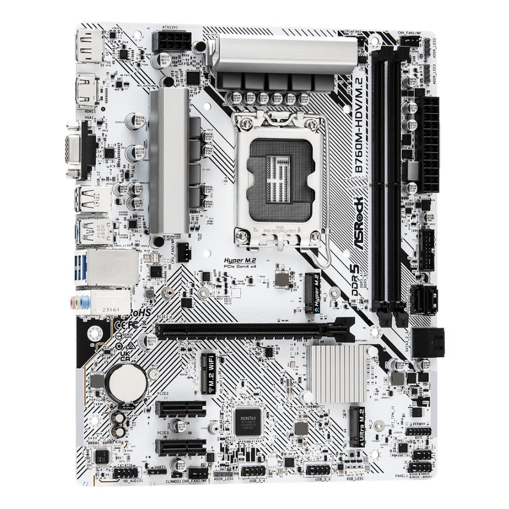 Asrock B760M-HDV/M.2. Processor manufacturer: Intel, Processor socket: LGA 1700, Compatible processor series: Intel Core i3 12th Gen, Intel Core i3 13th Gen, Intel Core i5 12th Gen, Intel Core i5 13th Gen,.... Supported memory types: DDR5-SDRAM, Maximum internal memory: 96 GB, Memory slots type: DIMM. Supported storage drive interfaces: M.2, SATA III, RAID levels: 0, 1, 5, 10. Ethernet interface type: 2.5 Gigabit Ethernet, LAN controller: Dragon RTL8125BG. Component for: PC, Motherboard form factor: micro ATX, Motherboard chipset family: Intel