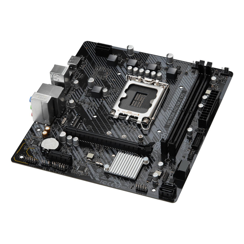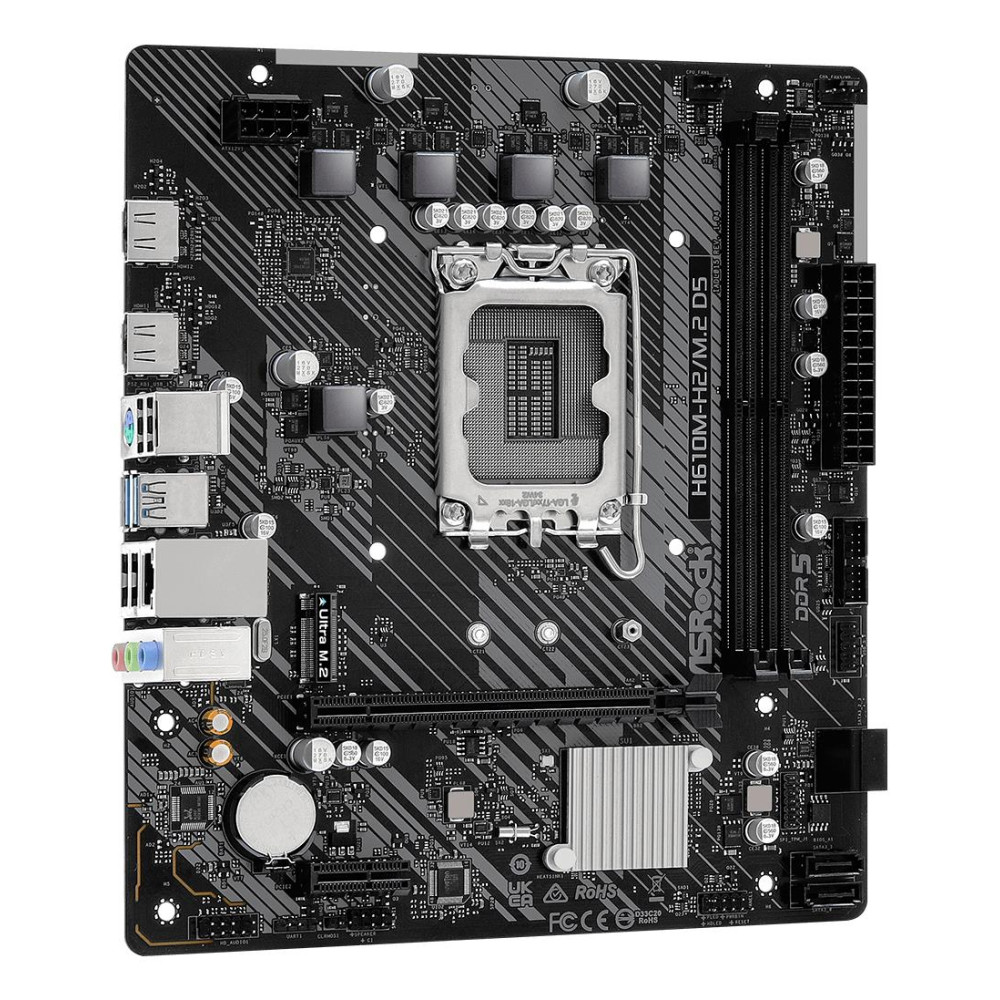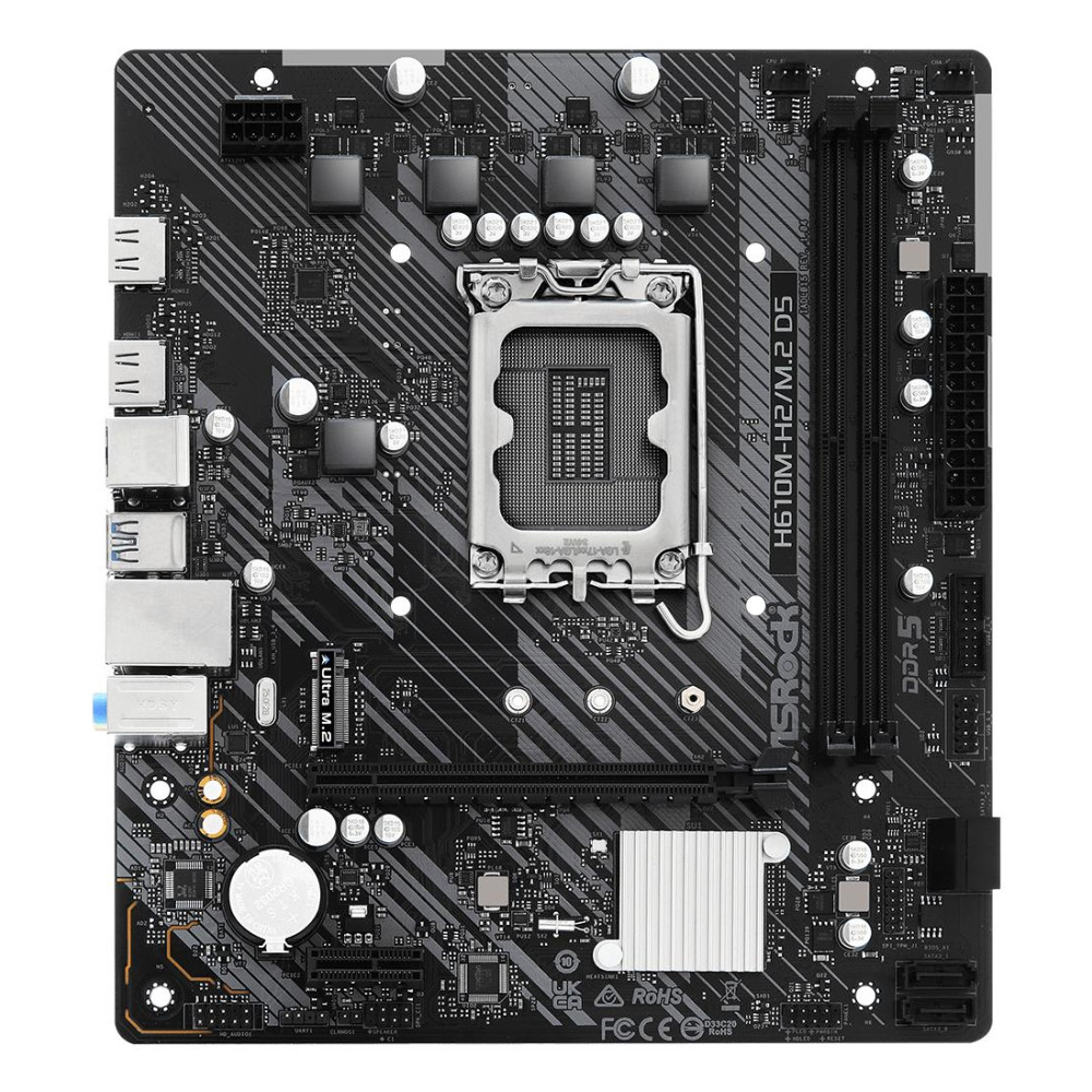 Summary Asrock H610M-H2/M.2 D5. Processor manufacturer: Intel, Processor socket: LGA 1700. Supported memory types: DDR5-SDRAM, Maximum internal memory: 96 GB, Memory slots type: DIMM. Supported storage drive interfaces: M.2, SATA III. Ethernet interface type: Gigabit Ethernet, LAN controller: Realtek 8111H. Component for: PC, Motherboard form factor: micro ATX, Motherboard chipset family: Intel