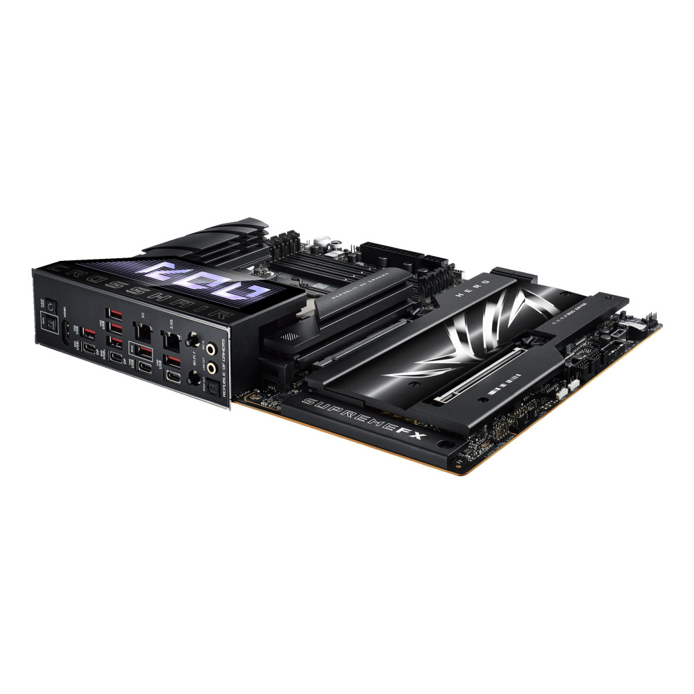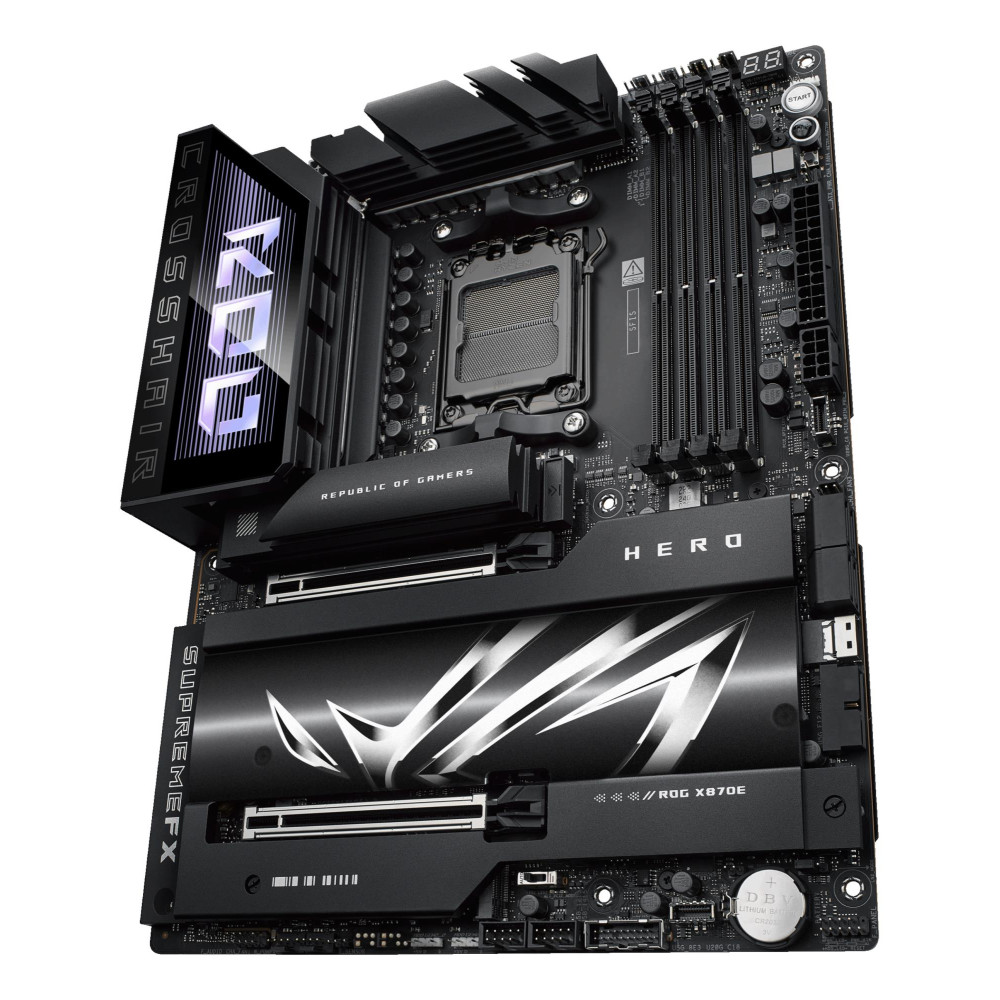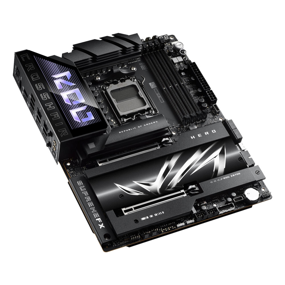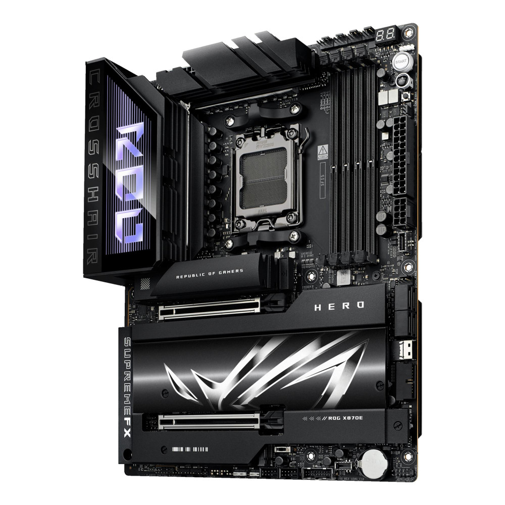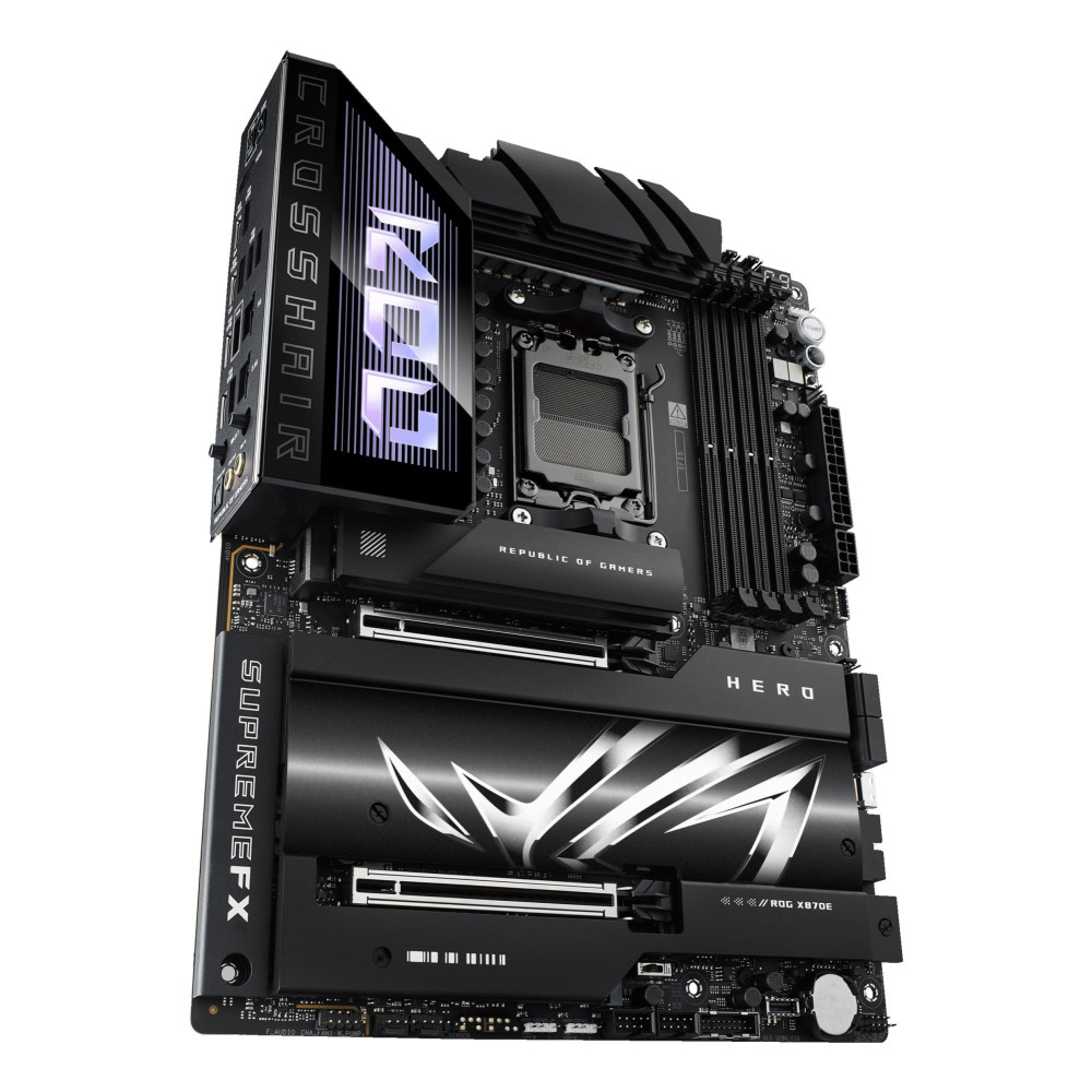 ASUS ROG CROSSHAIR X870E HERO. Processor manufacturer: AMD, Processor socket: Socket AM5, Supported processor sockets: Socket AM5. Supported memory types: DDR5-SDRAM, Maximum internal memory: 192 GB, Memory slots type: DIMM. Supported storage drive interfaces: M.2, SATA III, SlimSAS, Supported storage drive types: HDD & SSD, RAID levels: 0, 1, 10, 5. Ethernet interface type: 2.5 Gigabit Ethernet, 5 Gigabit Ethernet, Top Wi-Fi standard: Wi-Fi 7 (802.11be), Wi-Fi standards: Wi-Fi 7 (802.11be). Component for: PC, Motherboard form factor: ATX, Motherboard chipset family: AMD