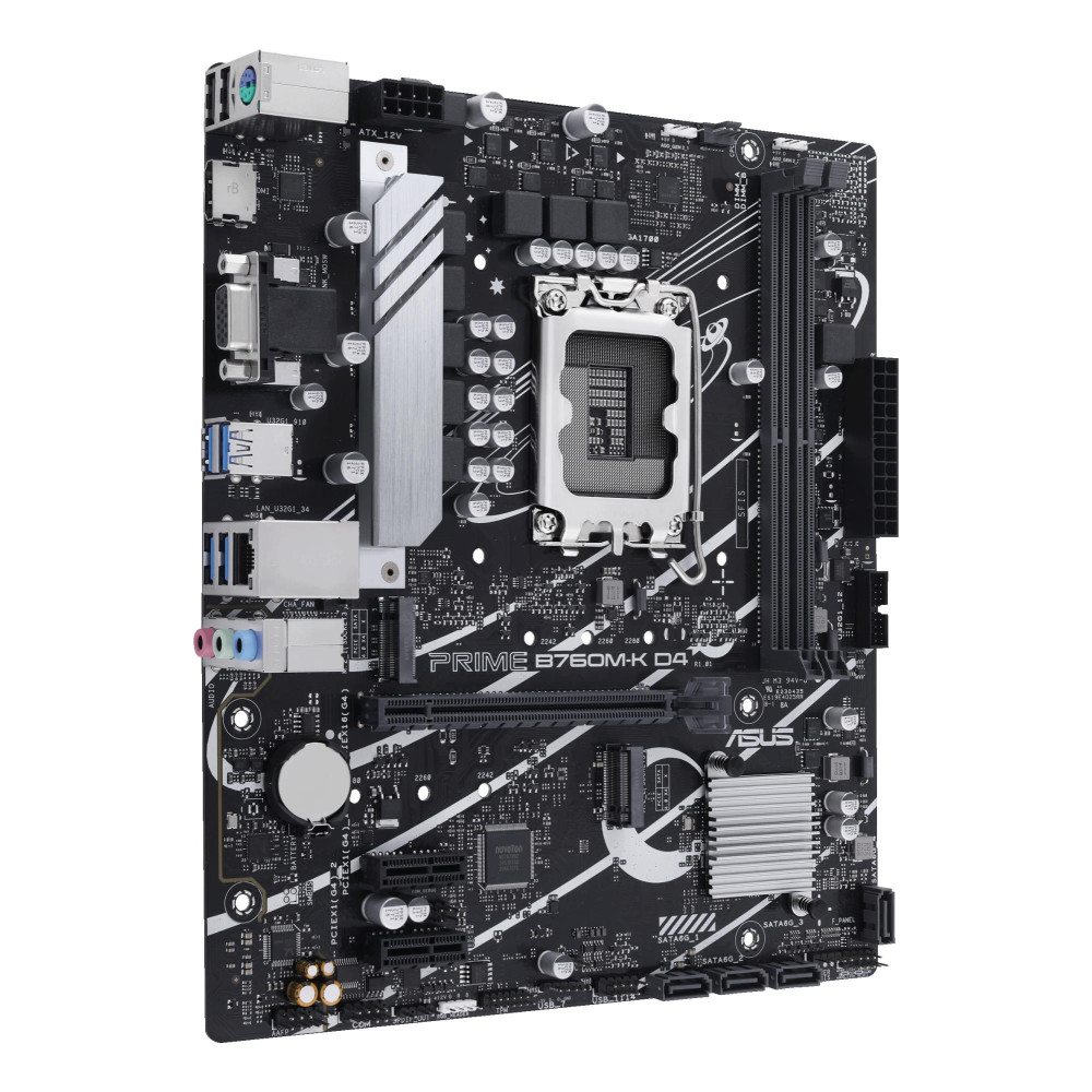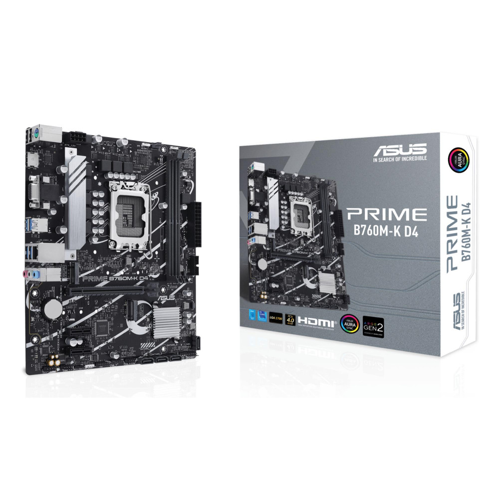 Summary ASUS PRIME B760M-K D4. Processor manufacturer: Intel, Processor socket: LGA 1700, Compatible processor series: Intel® Celeron®, Intel® Core™ i3, Intel® Core™ i5, Intel® Core™ i7, Intel® Core™ i9,.... Supported memory types: DDR4-SDRAM, Maximum internal memory: 64 GB, Memory slots type: DIMM. Supported storage drive interfaces: M.2, SATA III, Supported storage drive types: HDD & SSD, RAID levels: 0, 1, 5, 10. USB connector type: USB Type-A. Ethernet interface type: 2.5 Gigabit Ethernet