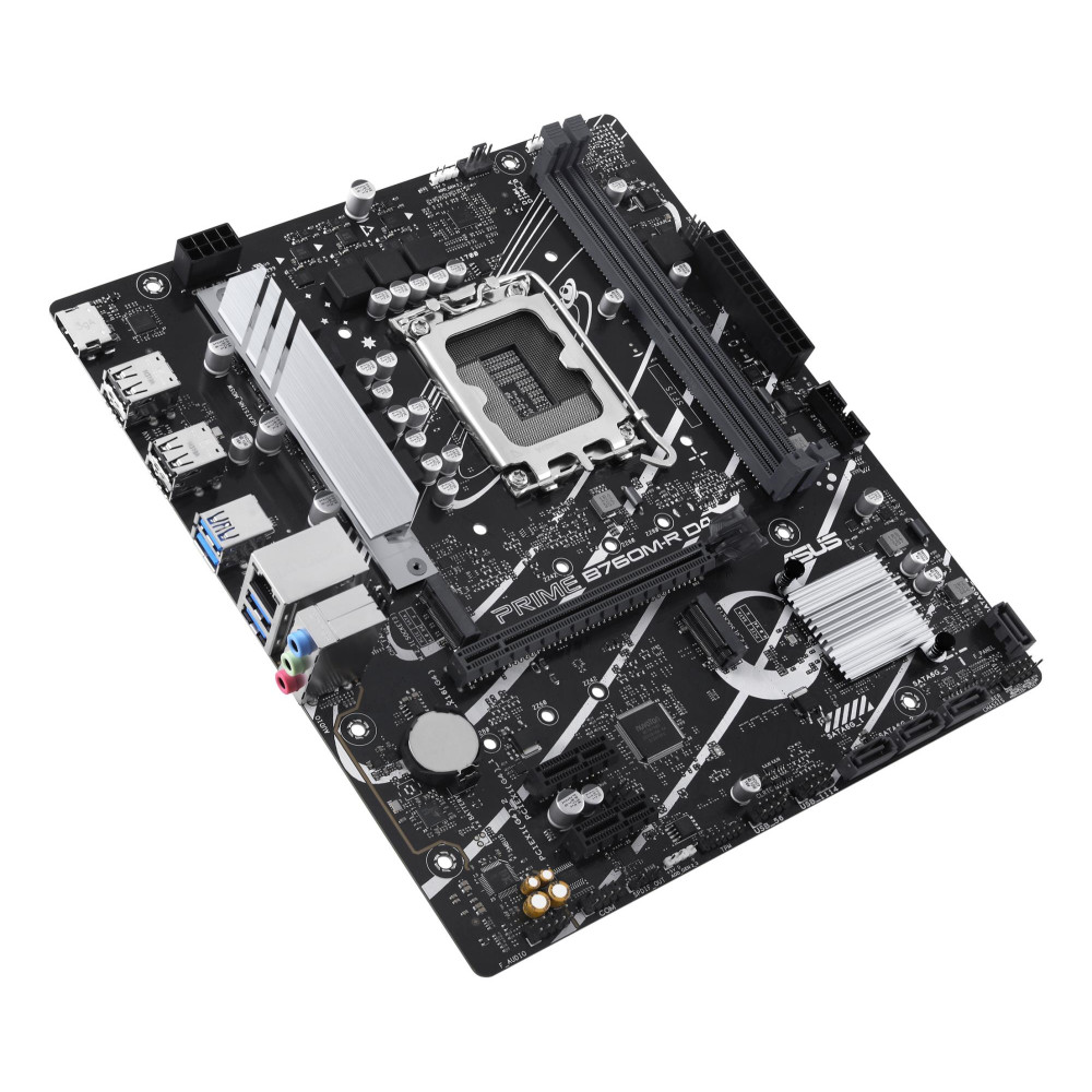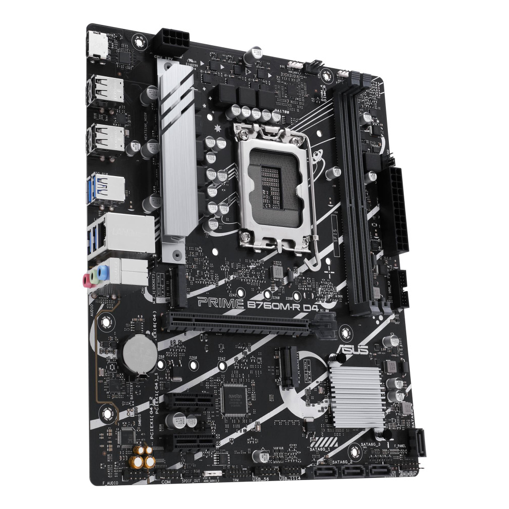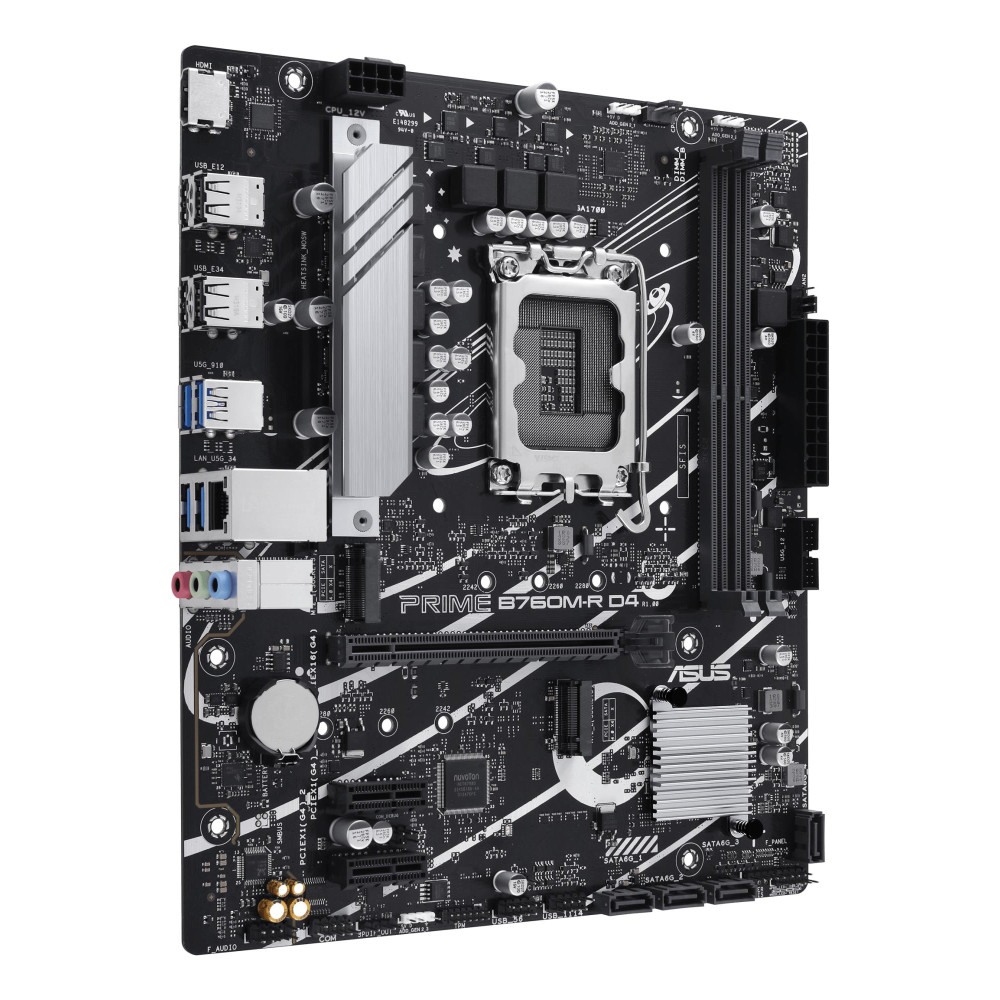 ASUS PRIME B760M-R D4. Processor manufacturer: Intel, Processor socket: LGA 1700, Compatible processor series: Intel Core i9 14th Gen, Intel Core i3 12th Gen, Intel Core i3 13th Gen, Intel Core i5 12th Gen,.... Supported memory types: DDR4-SDRAM, Maximum internal memory: 64 GB, Memory slots type: DIMM. Supported storage drive interfaces: M.2, SATA III, Supported storage drive types: HDD & SSD, RAID levels: 0, 1, 5, 10. Ethernet interface type: 2.5 Gigabit Ethernet. Component for: PC, Motherboard form factor: micro ATX, Motherboard chipset family: Intel