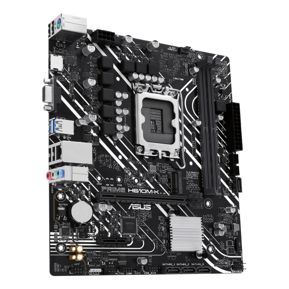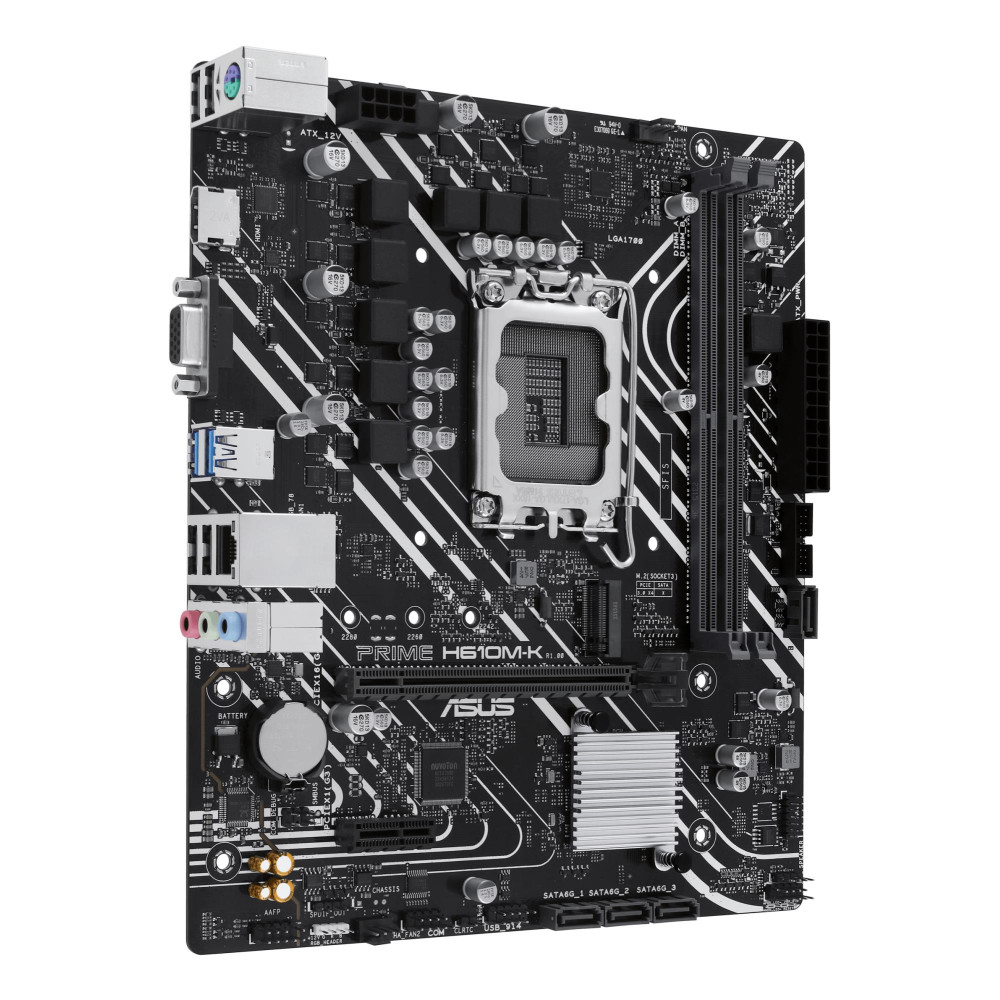 ASUS Prime H610M-K. Processor manufacturer: Intel, Processor socket: LGA 1700, Compatible processor series: Intel® Celeron®, Intel® Core™ i3, Intel® Core™ i5, Intel® Core™ i7, Intel® Core™ i9,.... Supported memory types: DDR5-SDRAM, Maximum internal memory: 96 GB, Memory slots type: DIMM. Supported storage drive interfaces: M.2, SATA III, Supported storage drive types: HDD & SSD. USB connector type: USB Type-A. Ethernet interface type: Gigabit Ethernet