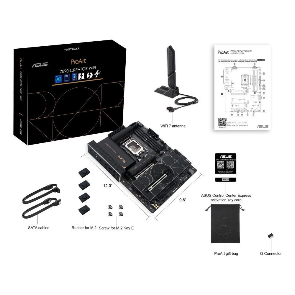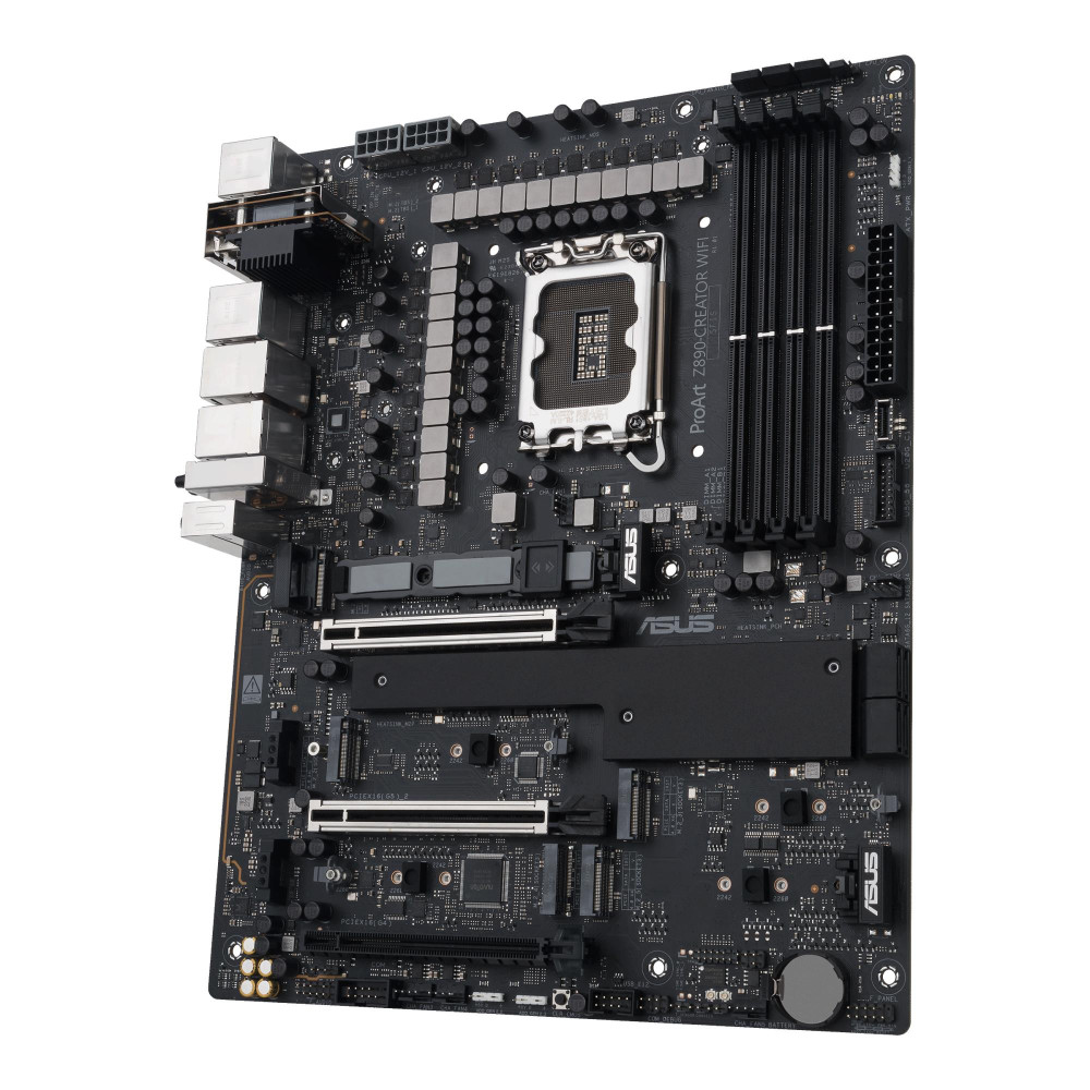ASUS PROART Z890-CREATOR WIFI. Processor manufacturer: Intel, Processor socket: LGA 1851 (Socket V1), Compatible processor series: Intel Core Ultra (Series 2). Supported memory types: DDR5-SDRAM, Maximum internal memory: 192 GB, Memory slots type: DIMM. Supported storage drive interfaces: M.2, SATA III, Supported storage drive types: HDD & SSD, RAID levels: 0, 1, 5, 10. Maximum resolution: 7680 x 4320 pixels. Ethernet interface type: 2.5 Gigabit Ethernet, 10 Gigabit Ethernet, Top Wi-Fi standard: Wi-Fi 7 (802.11be), Wi-Fi standards: Wi-Fi 7 (802.11be)