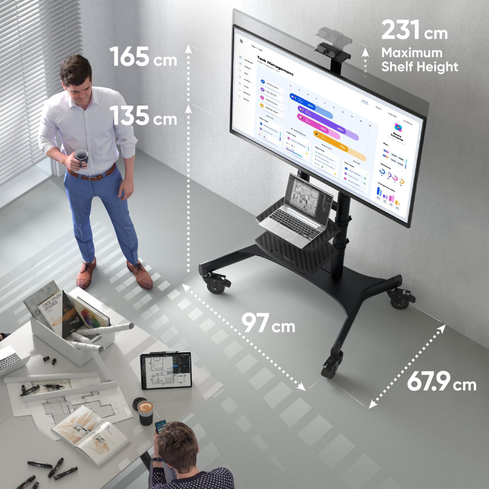 Summary ONKRON TS1881-B. Maximum weight capacity: 105.9 kg, Minimum screen size: 127 cm (50), Maximum screen size: 2.18 m (86), Minimum VESA mount: 200 x 200 mm, Maximum VESA mount: 800 x 500 mm. Height adjustment range: 1350 - 1650 mm. Product colour: Black