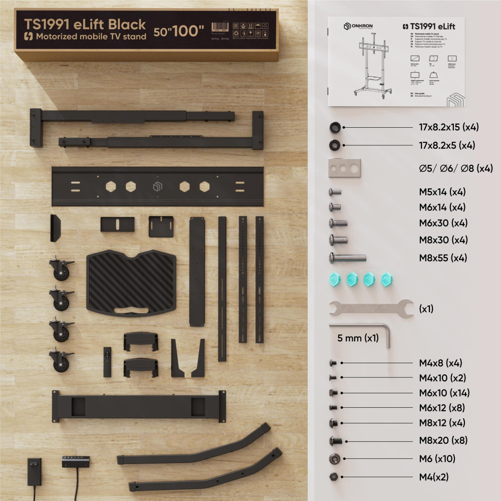 Summary ONKRON TS1991E-B. Maximum weight capacity: 130 kg, Minimum screen size: 127 cm (50), Maximum screen size: 2.54 m (100), Minimum VESA mount: 200 x 200 mm, Maximum VESA mount: 1000 x 600 mm. Height adjustment range: 1130 - 1600 mm, Tilt angle range: -5 - 5°. Product colour: Black