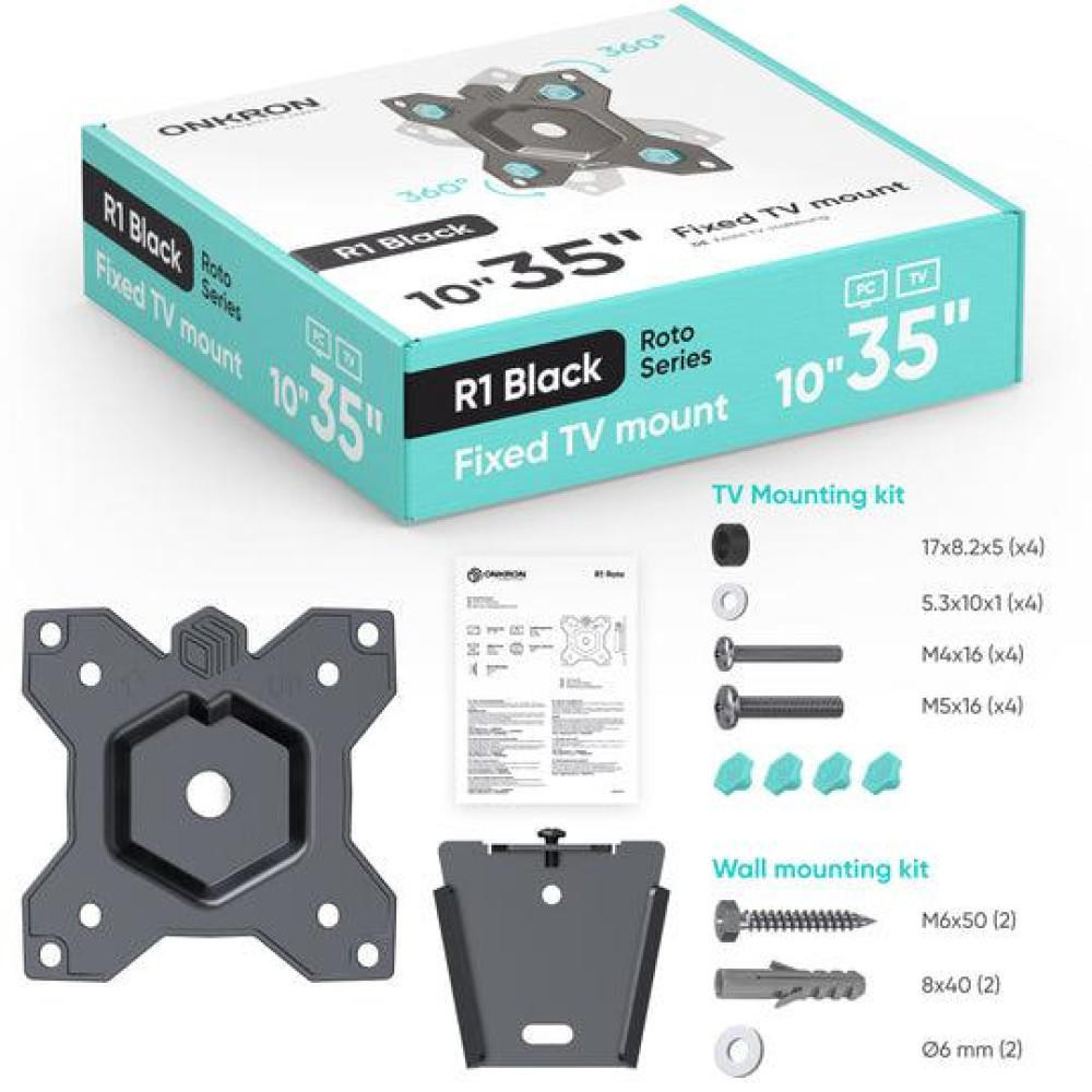 ONKRON R1-B. Maximum weight capacity: 20 kg, Minimum screen size: 25.4 cm (10), Maximum screen size: 88.9 cm (35), Minimum VESA mount: 75 x 75 mm, Maximum VESA mount: 100 x 100 mm. Angle of rotation: 360°, Distance to the wall (max): 2.2 cm. Product colour: Black